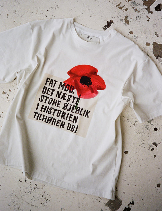 The film ‘Skarpretteren’ ends with “Courage! The next great moment in history is ours!” (in Danish: ”Fat Mod. Det næste store øjeblik i historien tilhører os!”). This quote is printed onto every style in the collection. The all-day event on March 8th in Mads Nørgaad’s flagship store Nørgaard paa Strøget presents a program of conversations and spoken words by female writers who interpret the iconic quote.