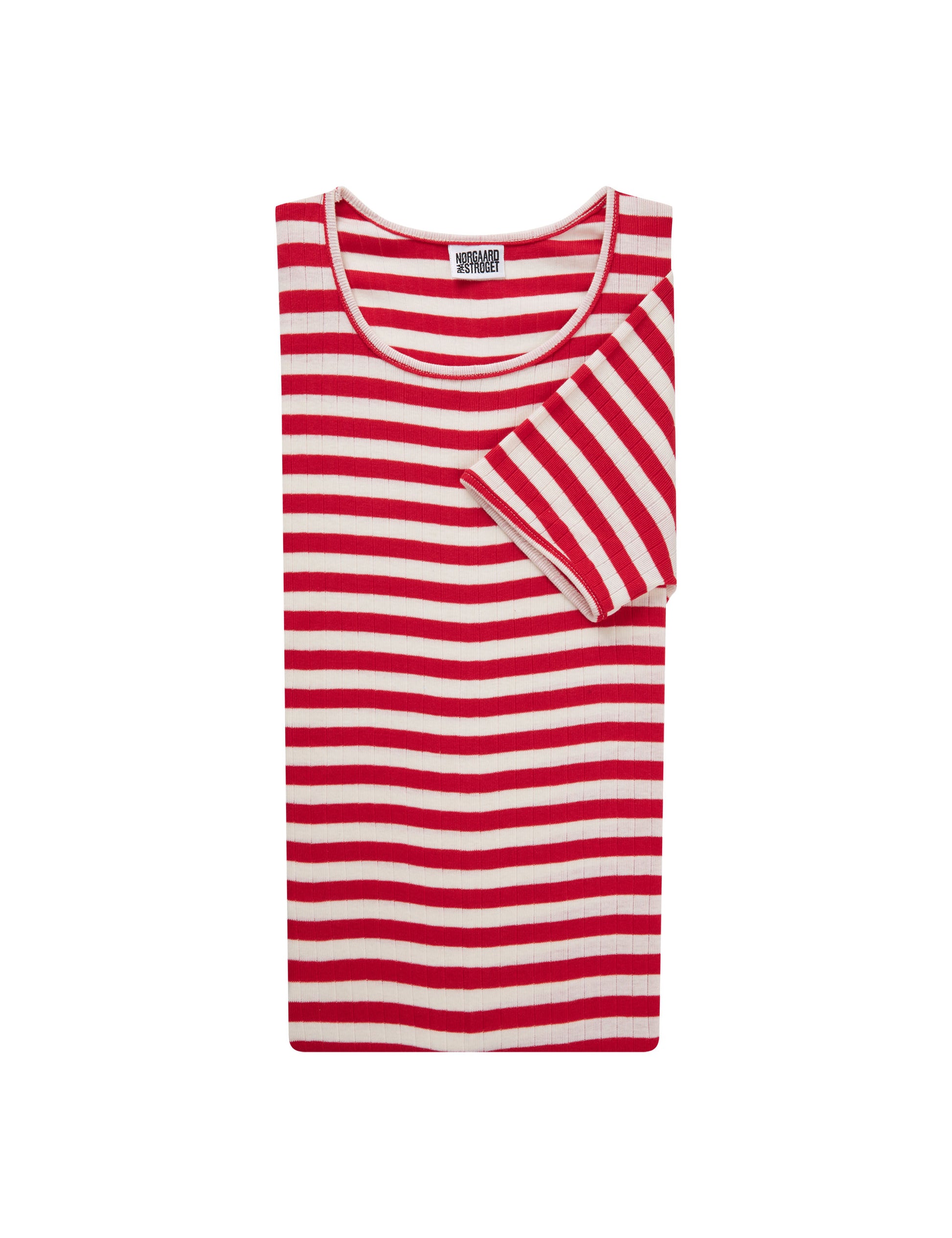 101 Short Sleeve Broadway Color is the classic #101 T-shirt in a short-sleeved, wide-striped version. Nørgaard paa Strøget's #101 T-shirt was designed in 1967 by Jørgen Nørgaard. The T-shirt is knitted, dyed and sewn in Denmark and is made from 100% cotton. The #101 Short Sleeve is one-size. The T-shirt is produced in three different types of stripes and in all the different colours of the rainbow.,
