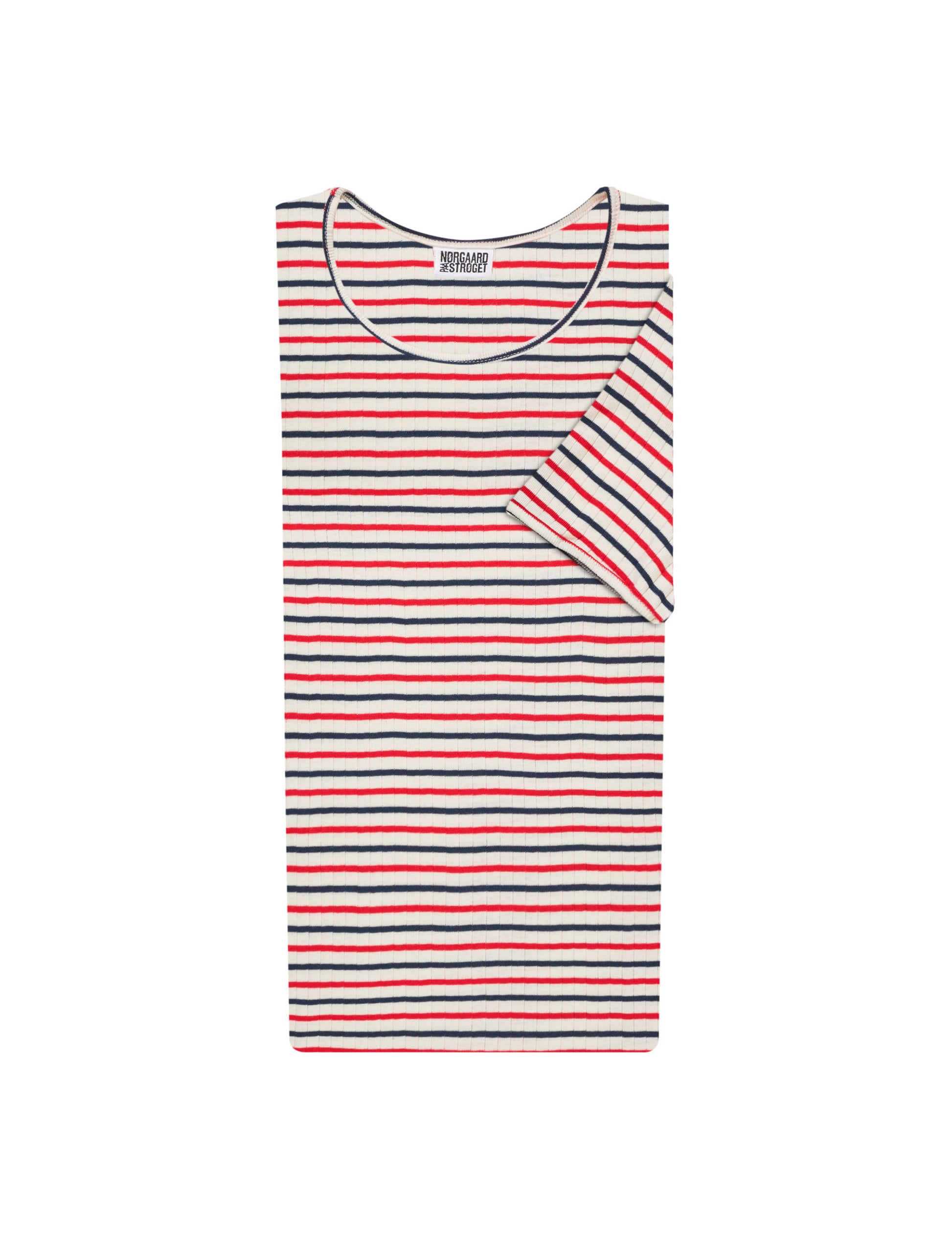 101 Short Sleeve Tricolore is the classic striped #101 T-shirt with three stripes. This edition is ecru/red/marine and has short sleeves. Nørgaard paa Strøget's #101 T-shirt was designed in 1967 by Jørgen Nørgaard. The T-shirt is knitted, dyed and sewn in Denmark and is made from 100% cotton. The #101 T-shirt is one-size, but comes in two different lengths. The T-shirt is produced in three different types of stripes and in all the different colours of the rainbow.
