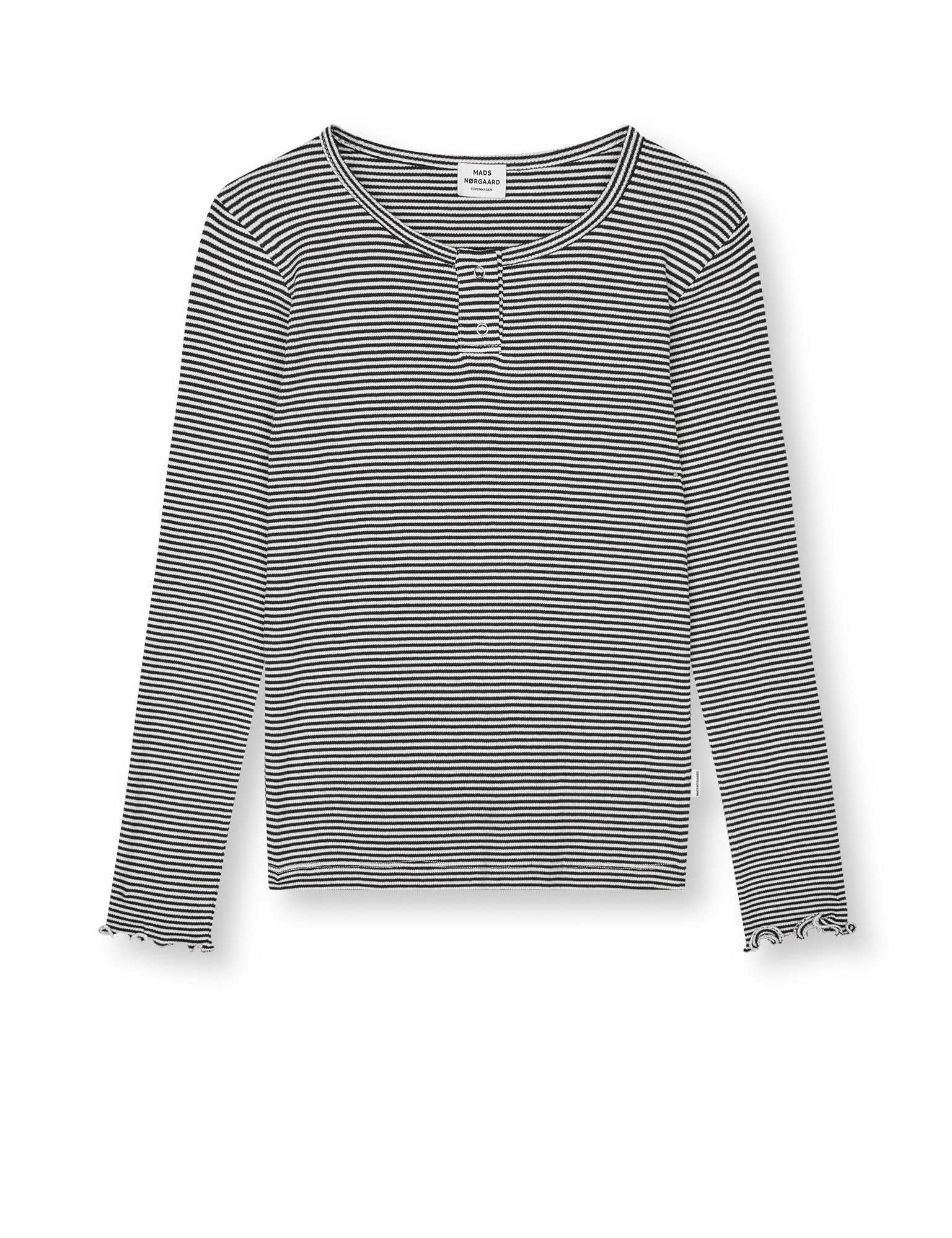Soft, fitted and stretchy long-sleeved T-shirt with round neck and short placket with press studs.