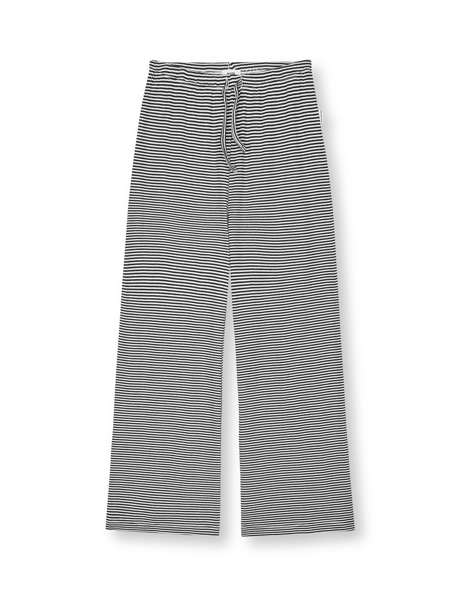 Soft, loose-fitting trousers with wide, straight legs and elasticated waistband with drawstring.
