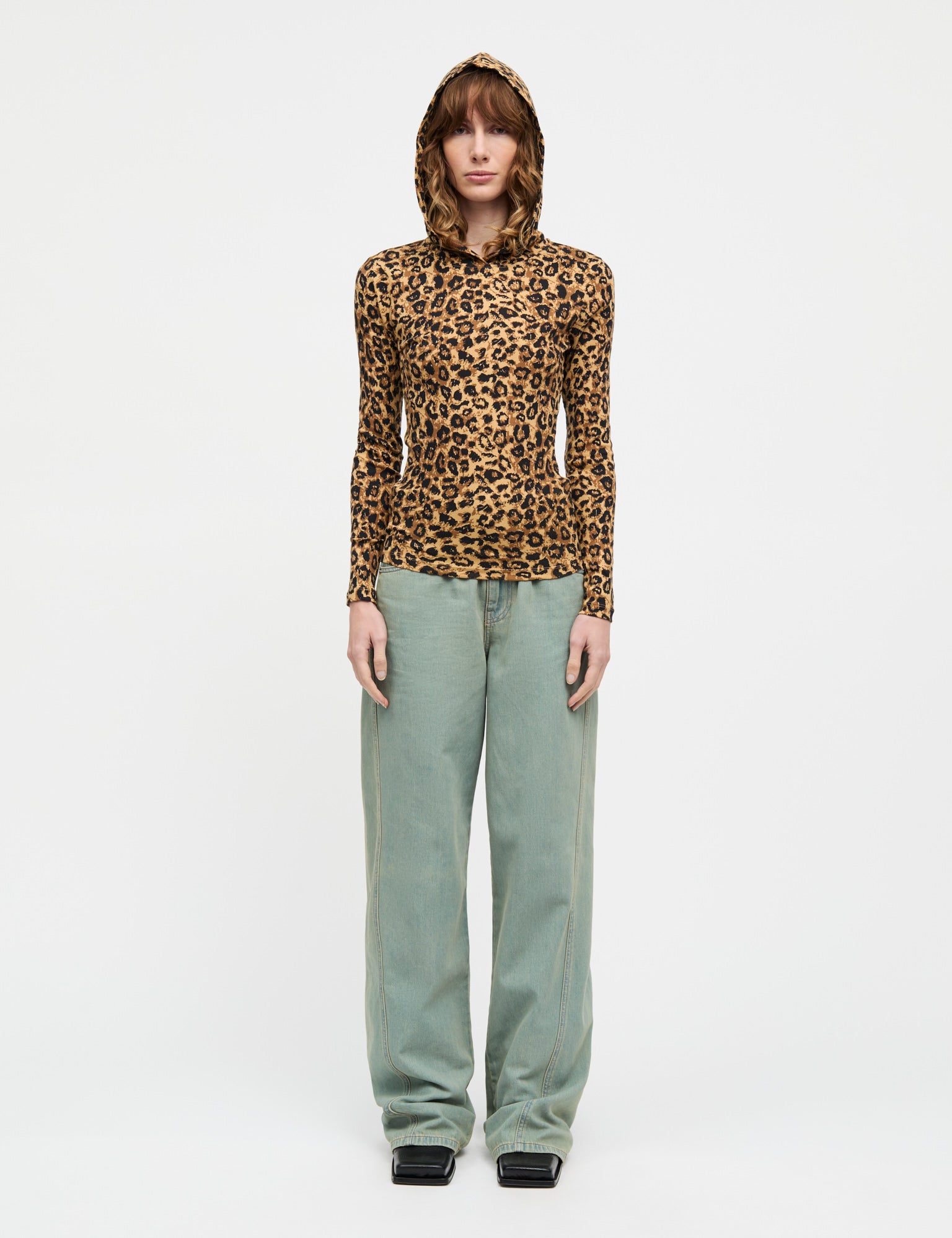 Stretchy and fitted long-sleeved T-shirt with hood and leopard print.