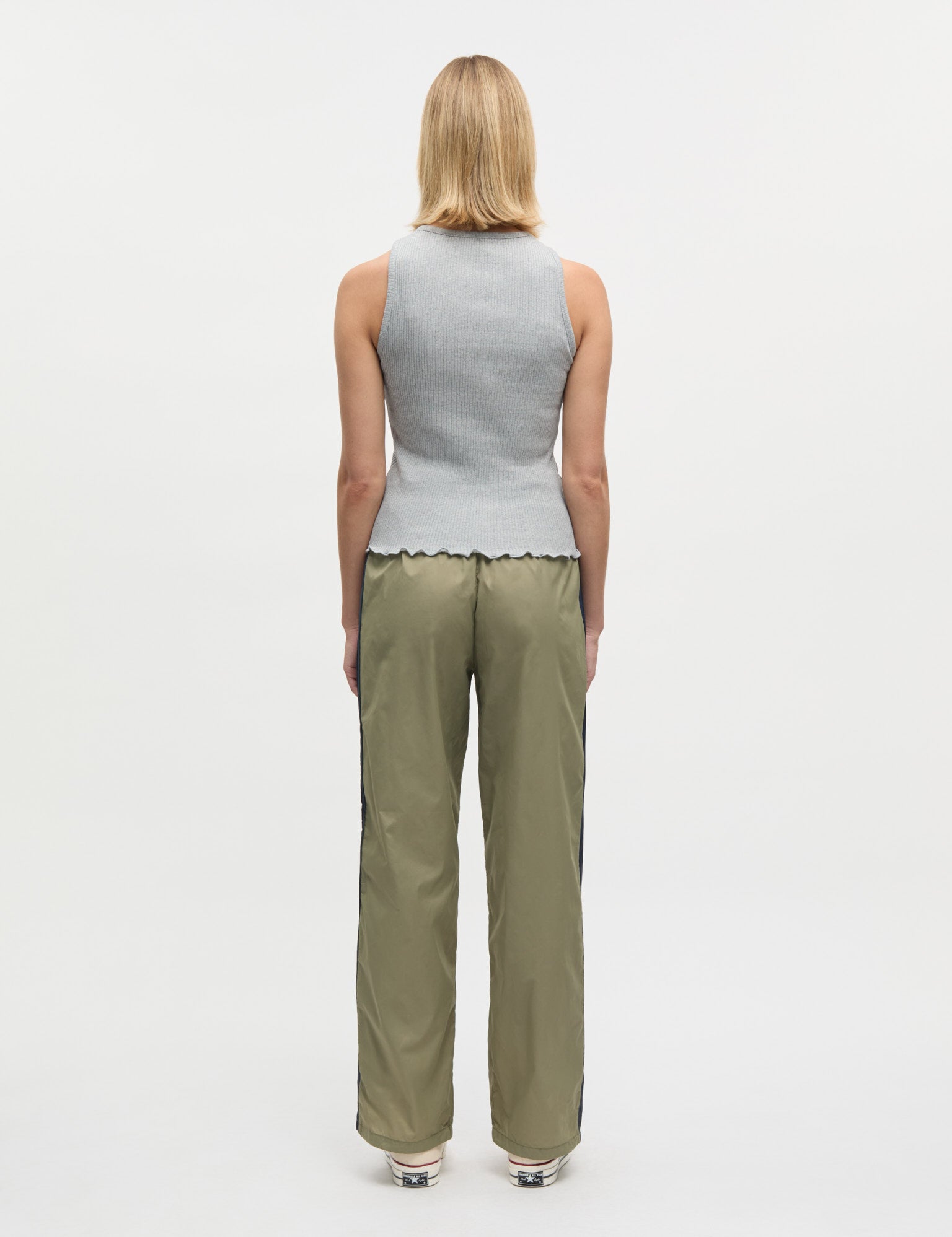Ribbed top with a round neckline, narrow straps, and a wavy hem at the bottom.