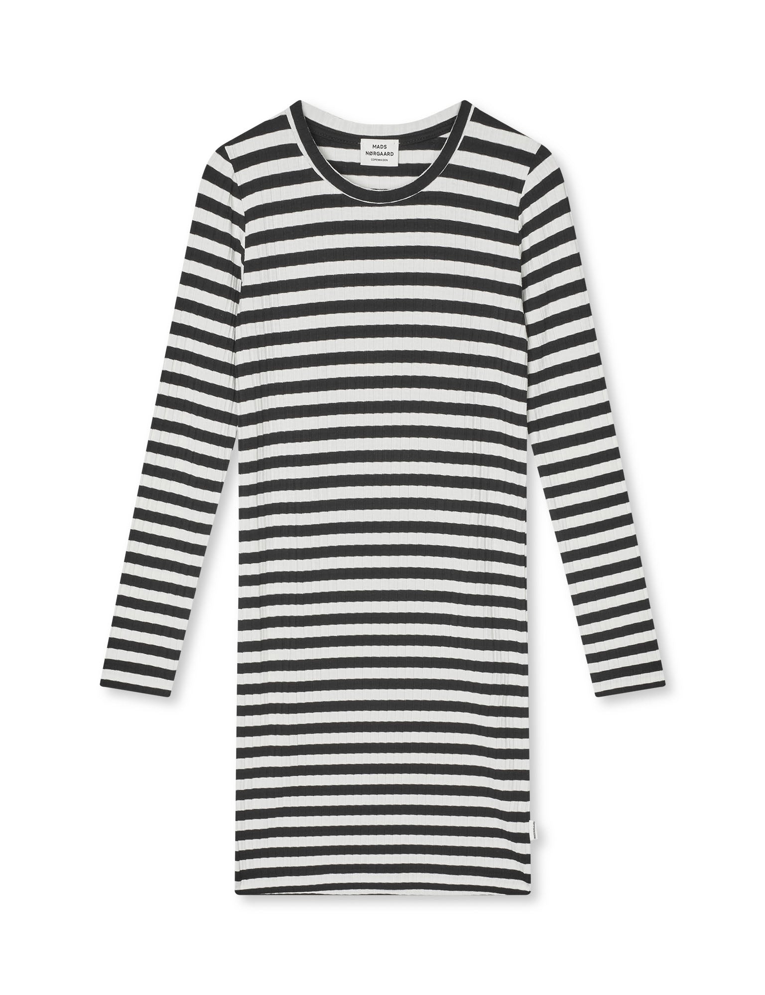 Soft, fitted and stretchy thigh-length dress with a round neck.