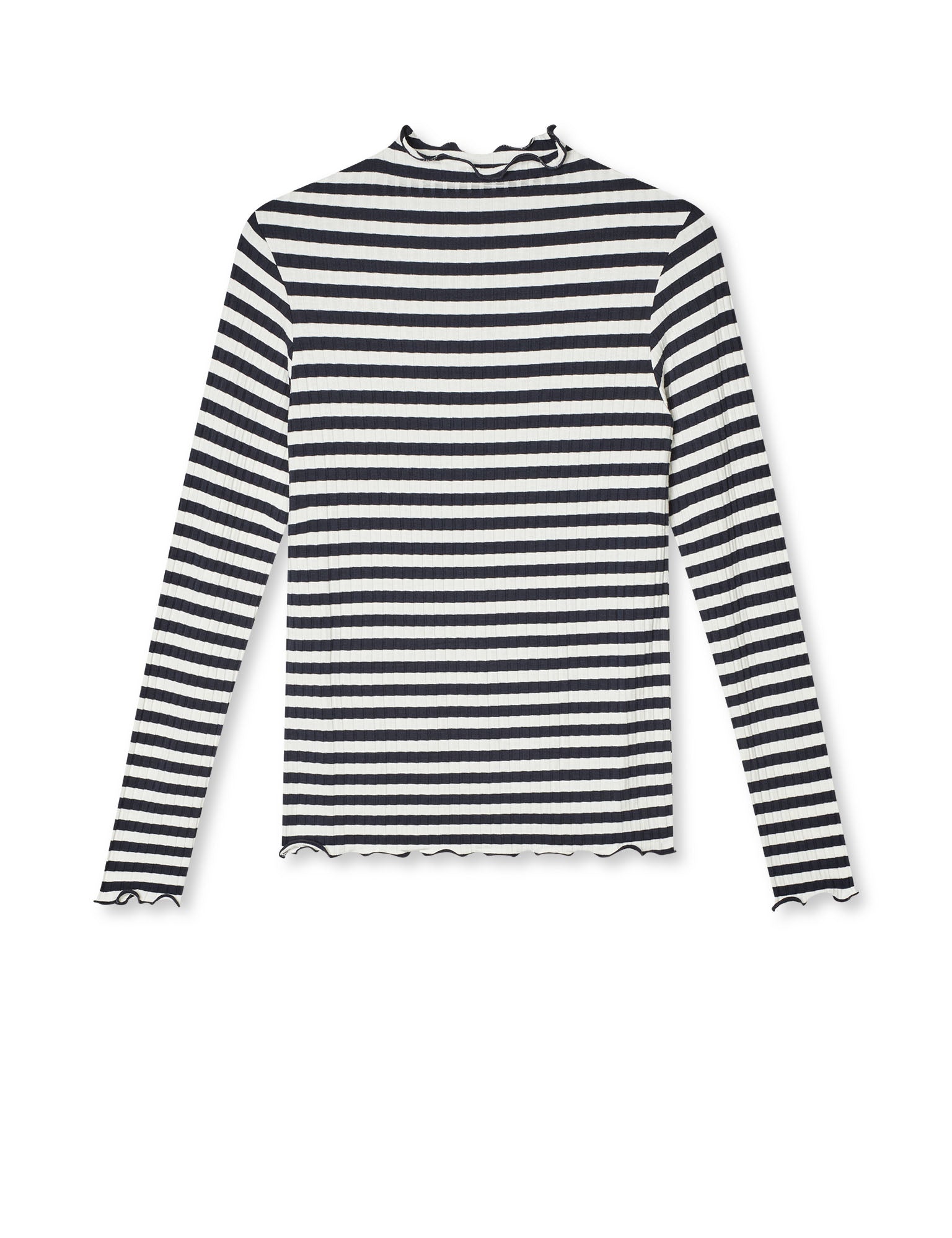 Stretchy and fitted long-sleeved T-shirt with a high neck and lettuce hem.