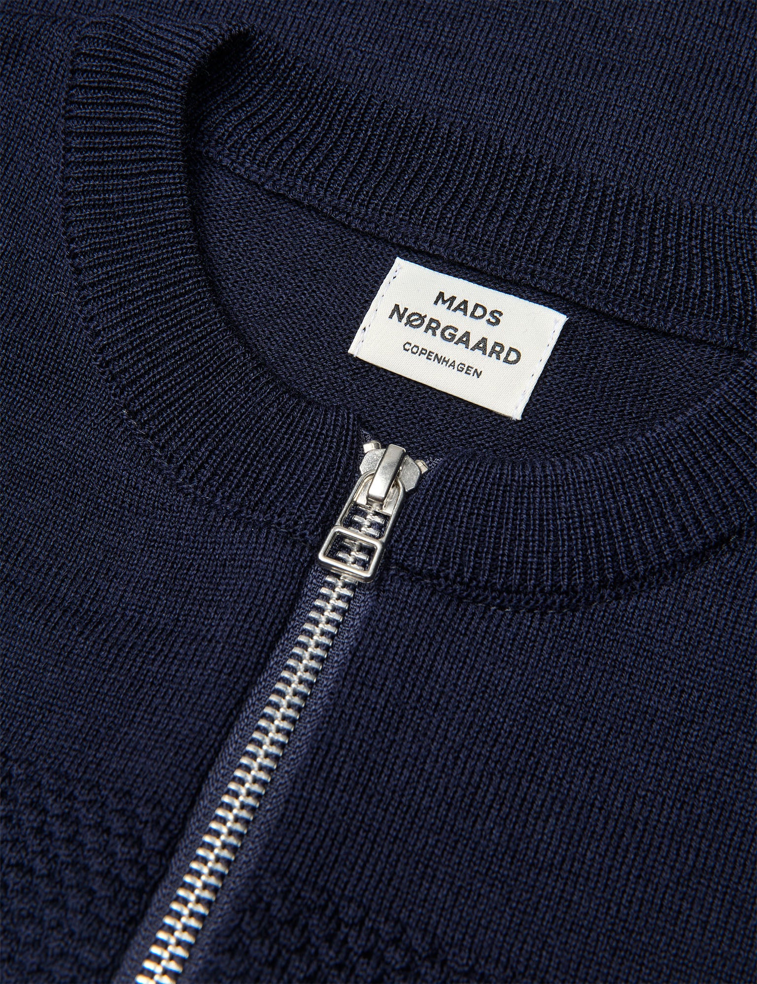Classic knitted cardigan with zip, is made of 100 % wool. It is densely knitted, it is heavy and it is really warm. The edges are rib knitted, the neck is high, the fit is tight and the style is sailor.