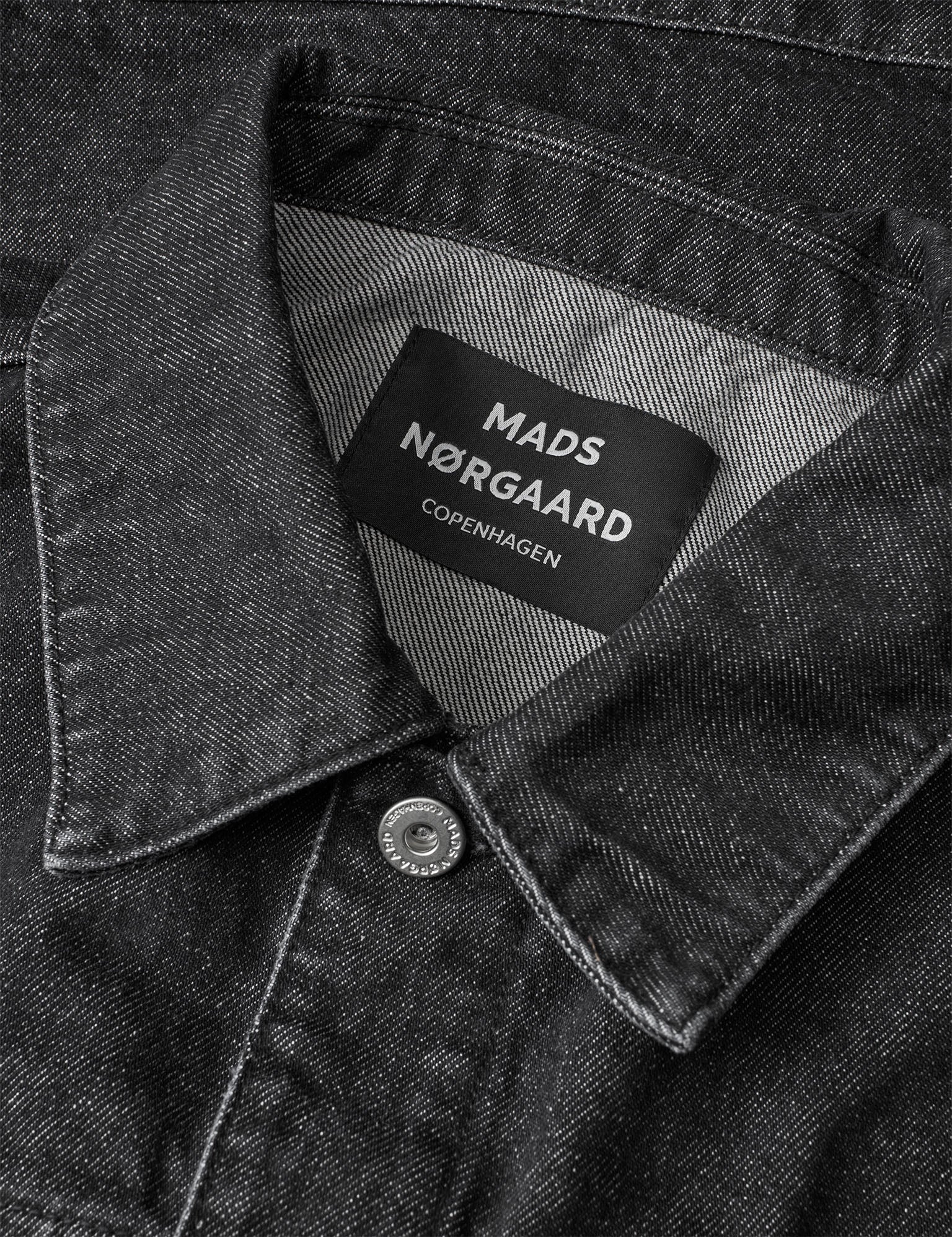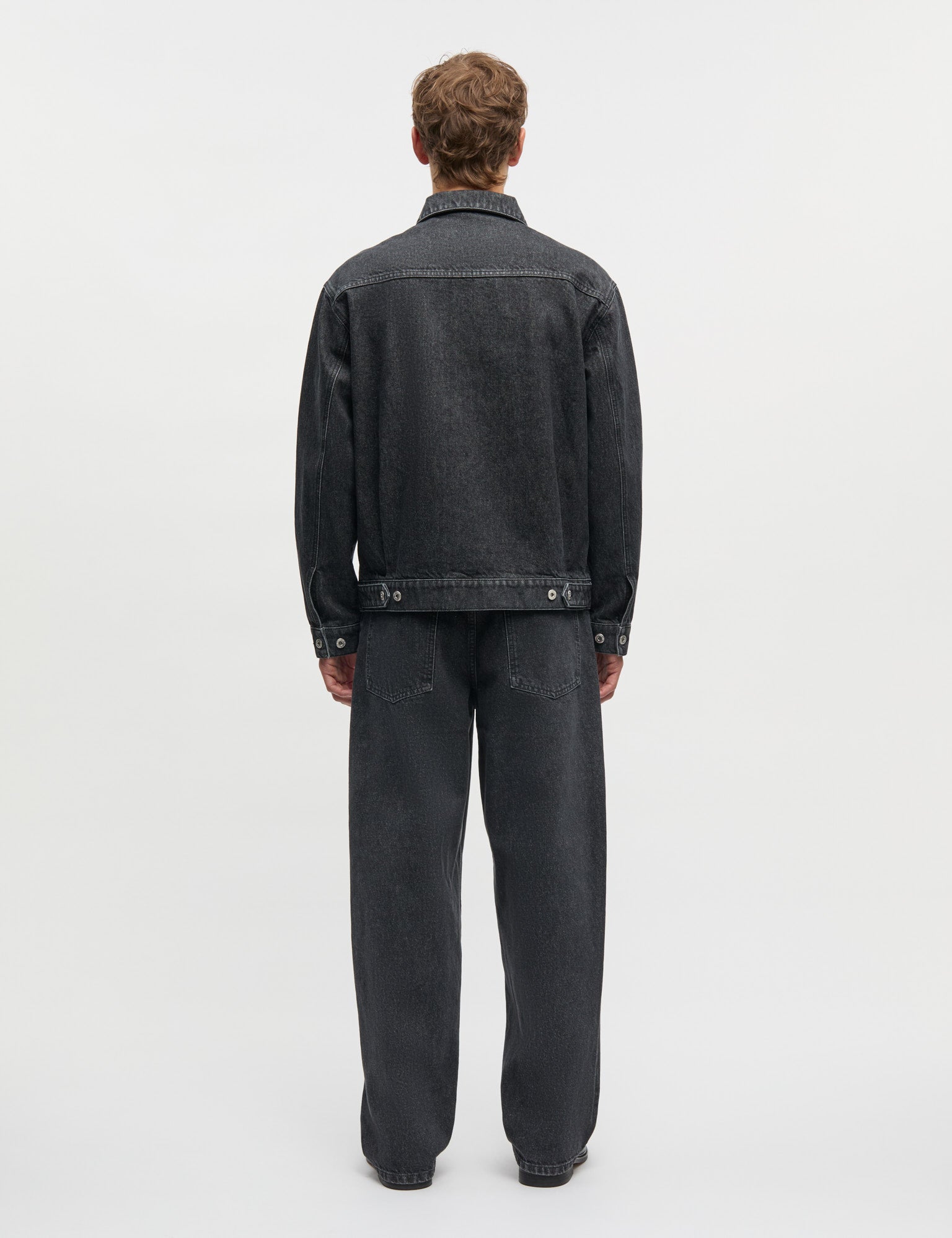 Straight-fit denim jacket with a classic collar and a washed look. The front has two chest pockets with flaps, vertical slit pockets and a full-length button closure. The sleeves end with cuffs, and the back is kept simple with marked seam lines.