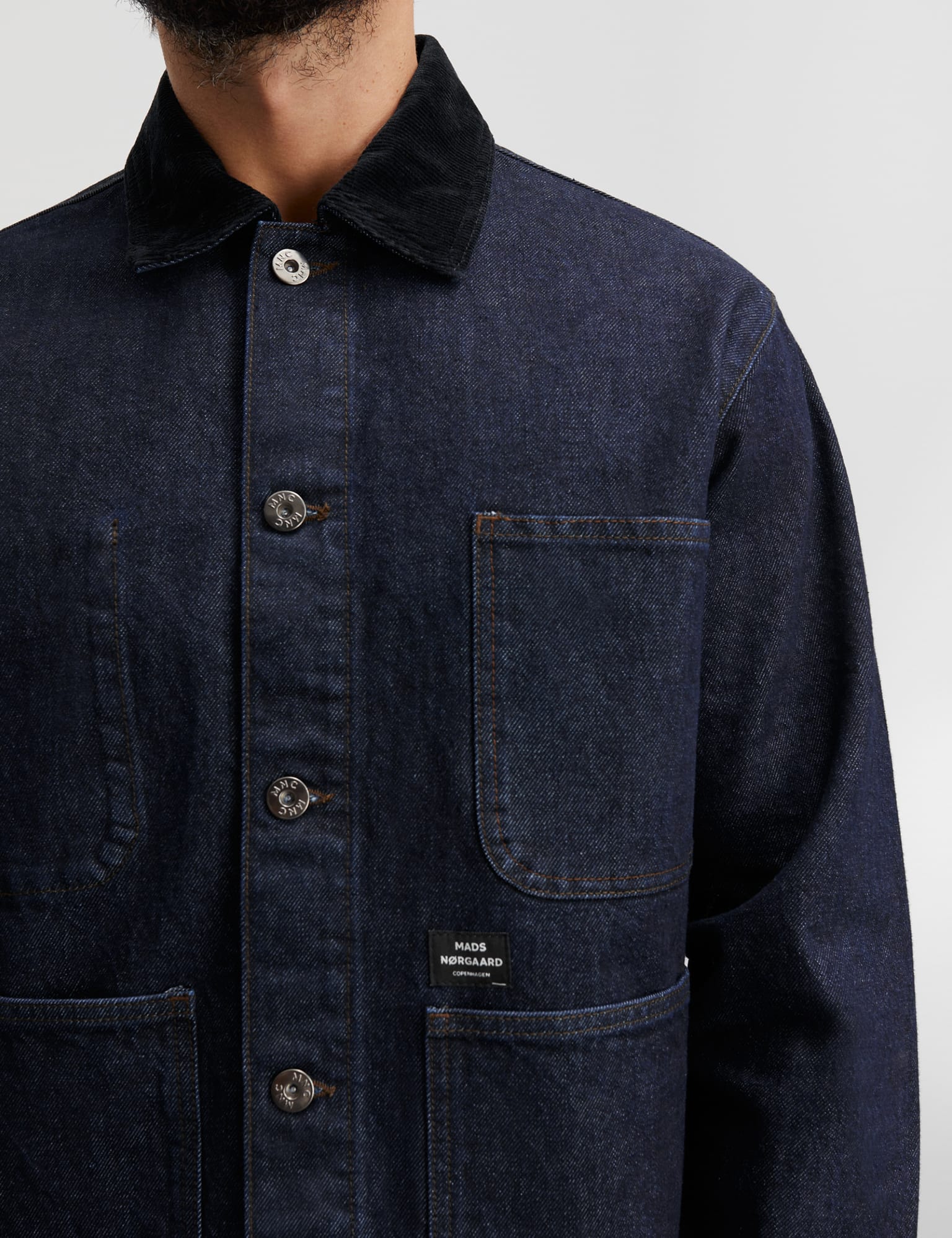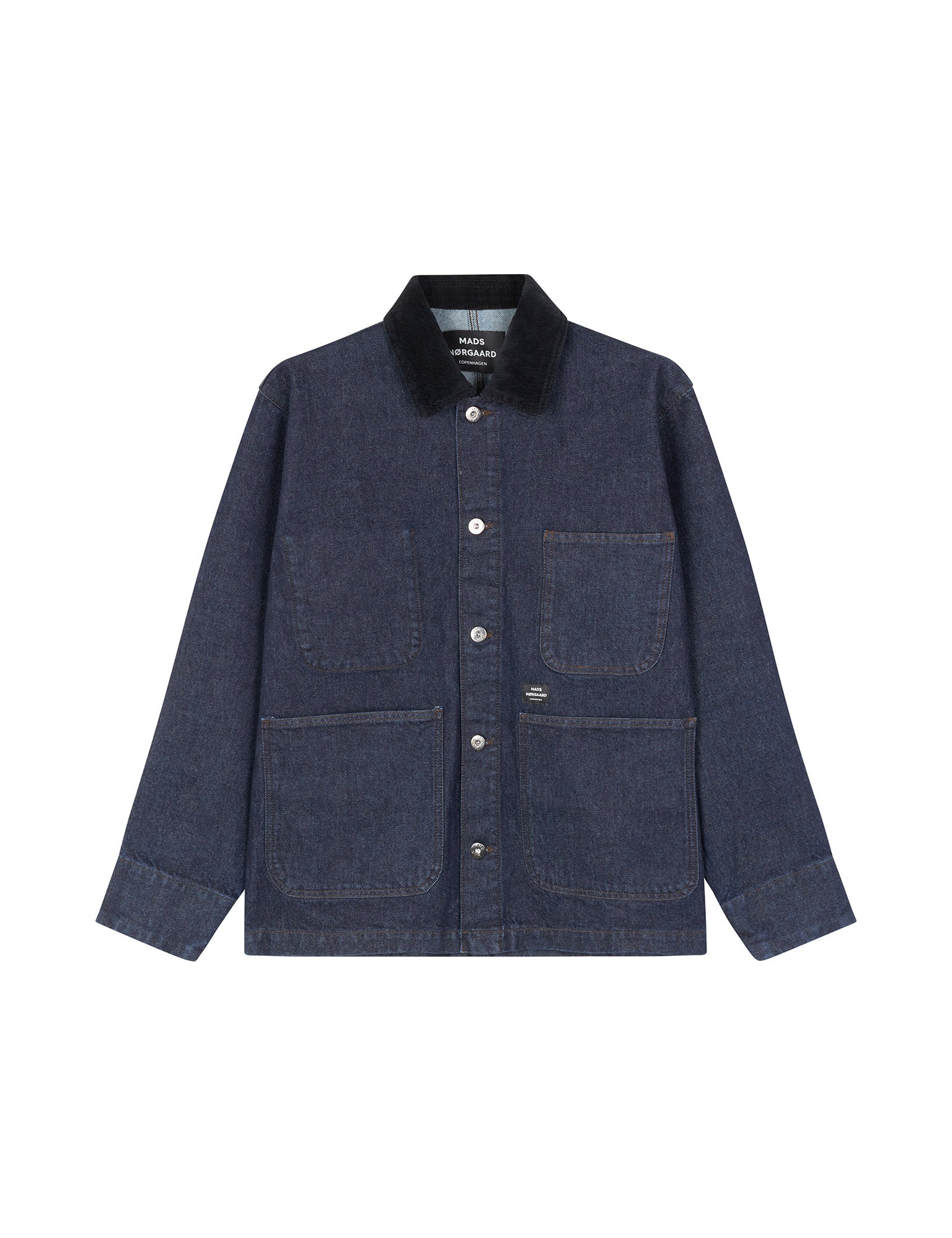 Classic workwear jacket in a weighty denim quality. The fit is slightly oversized. With four large front pockets and a corduroy collar.