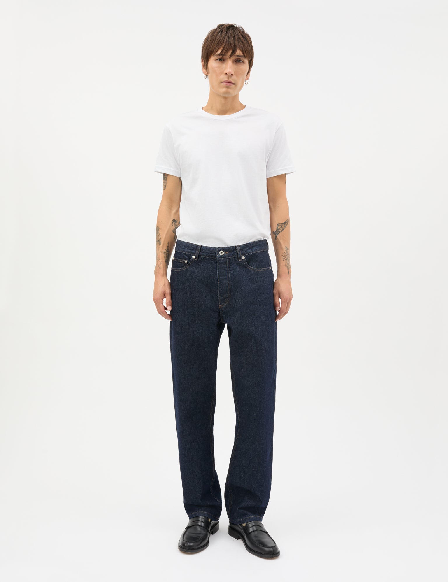 Loose-fitting 5-pocket jeans with straight legs, leather label at the back, zip and button.