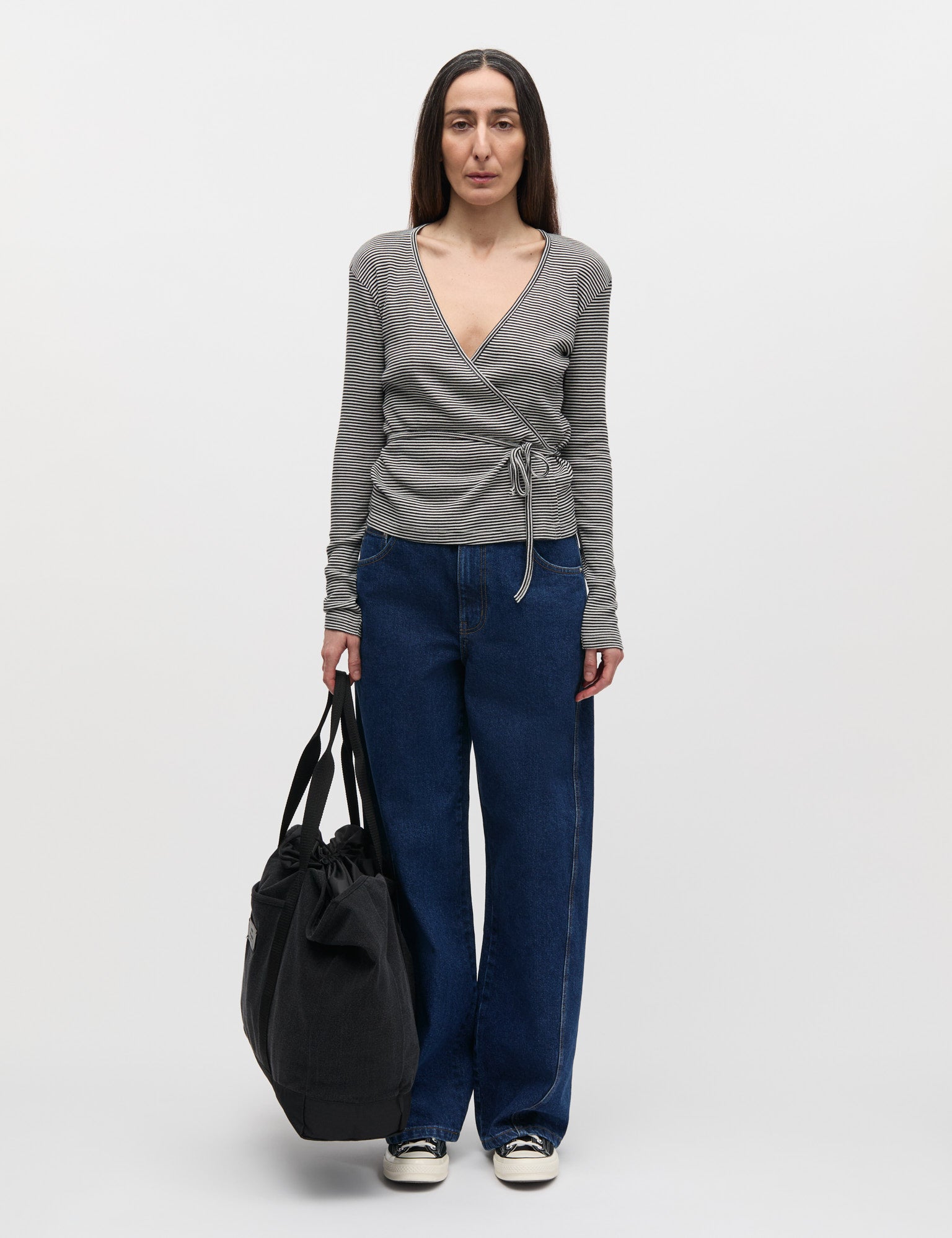 Shopper with two handles, outer pocket, inner pocket, reinforced bottom and all-black logo label.