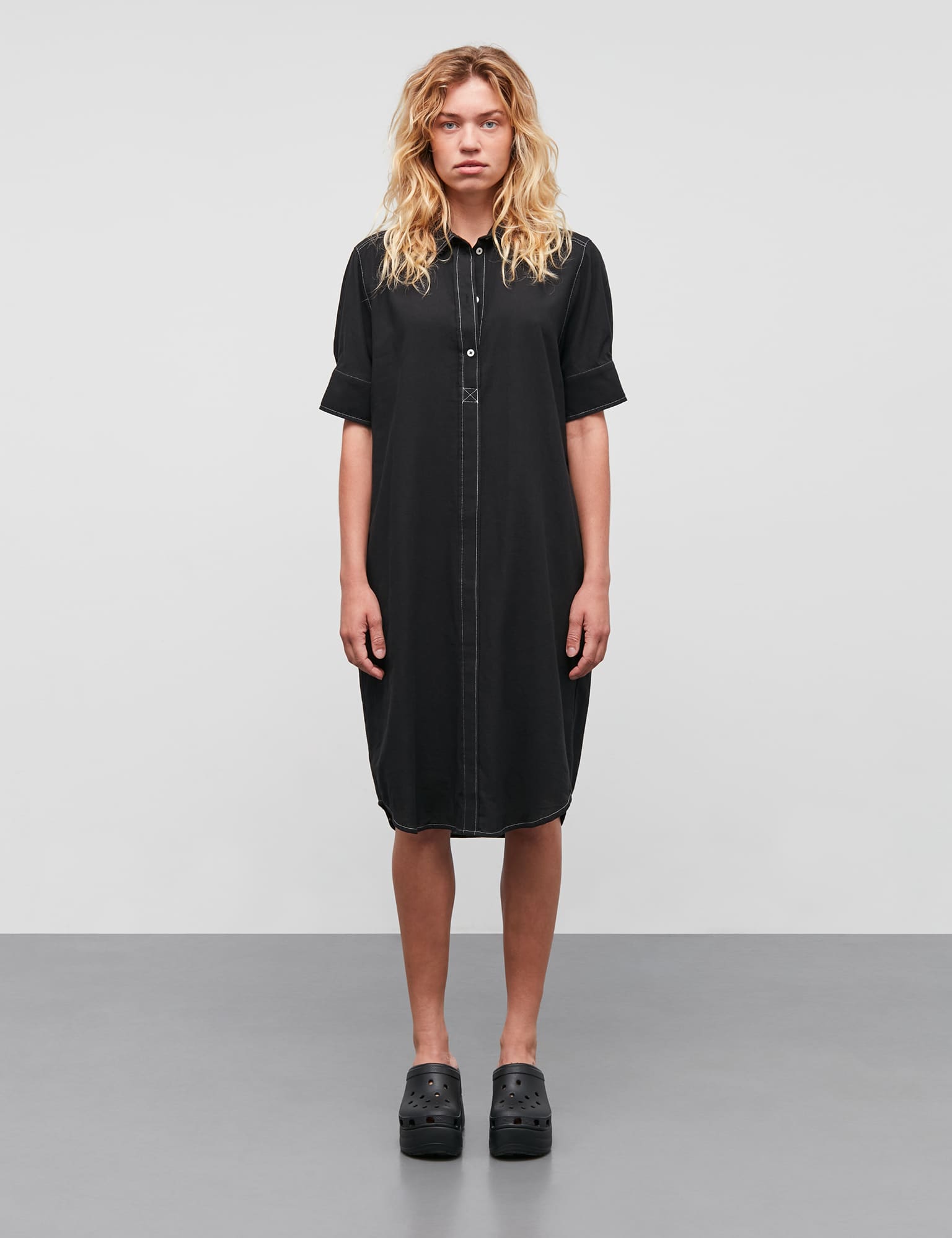 A slightly oversized and short-sleeved dress in a lightweight linen and cotton blend with white stitching, small buttons, placket and a classic collar.