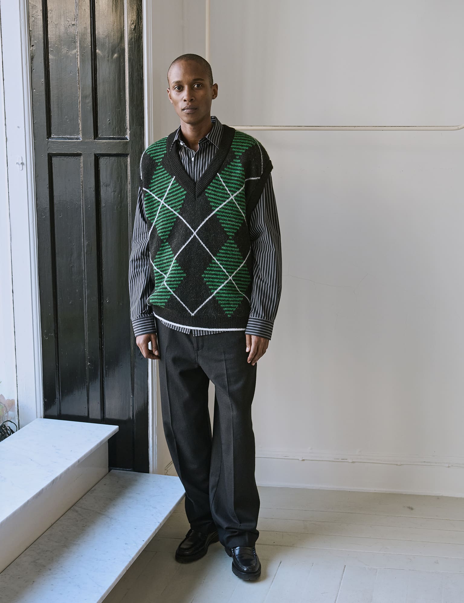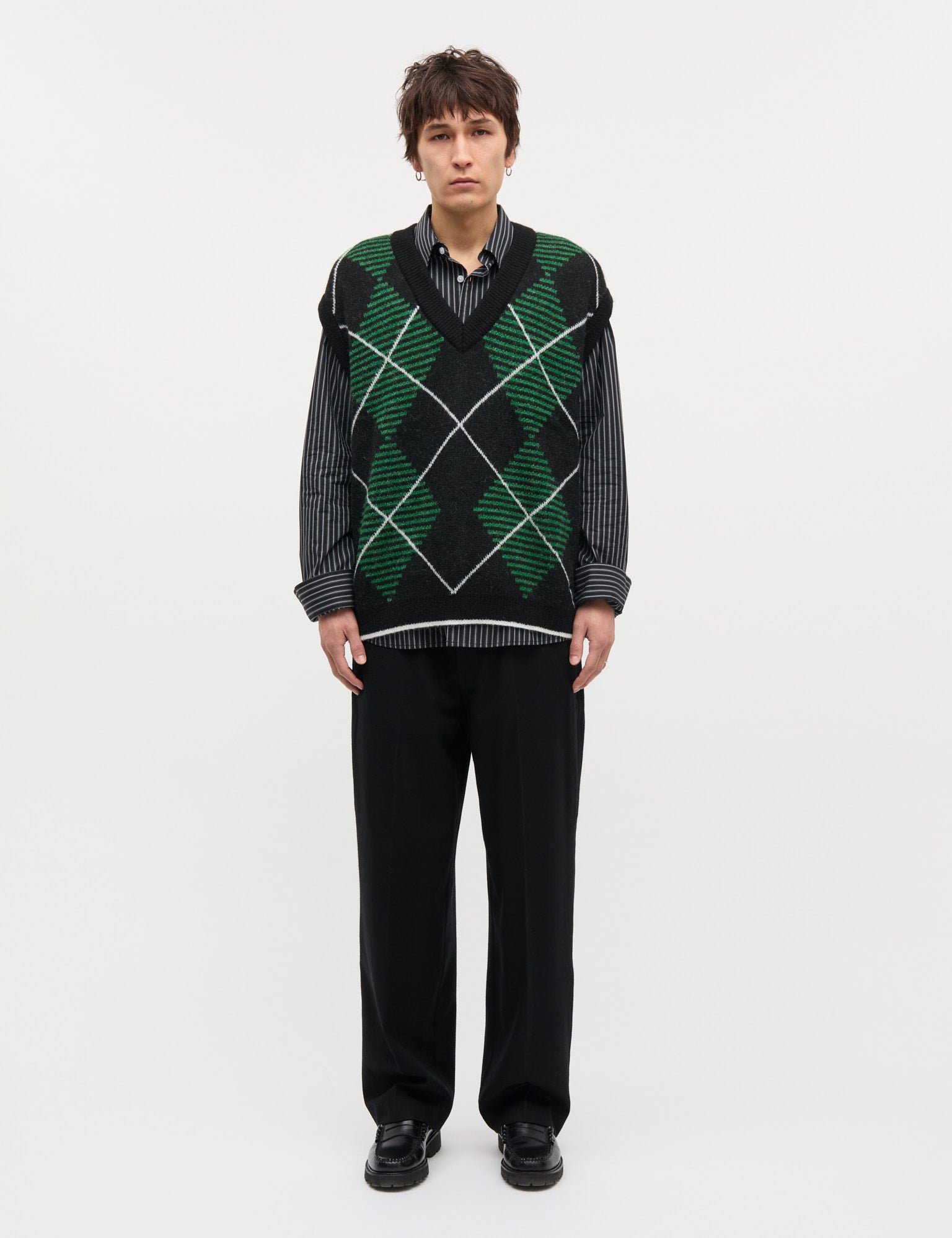 Soft and boxy knitted vest with harlequin checks, stripes, V-neck and ribbed trim.