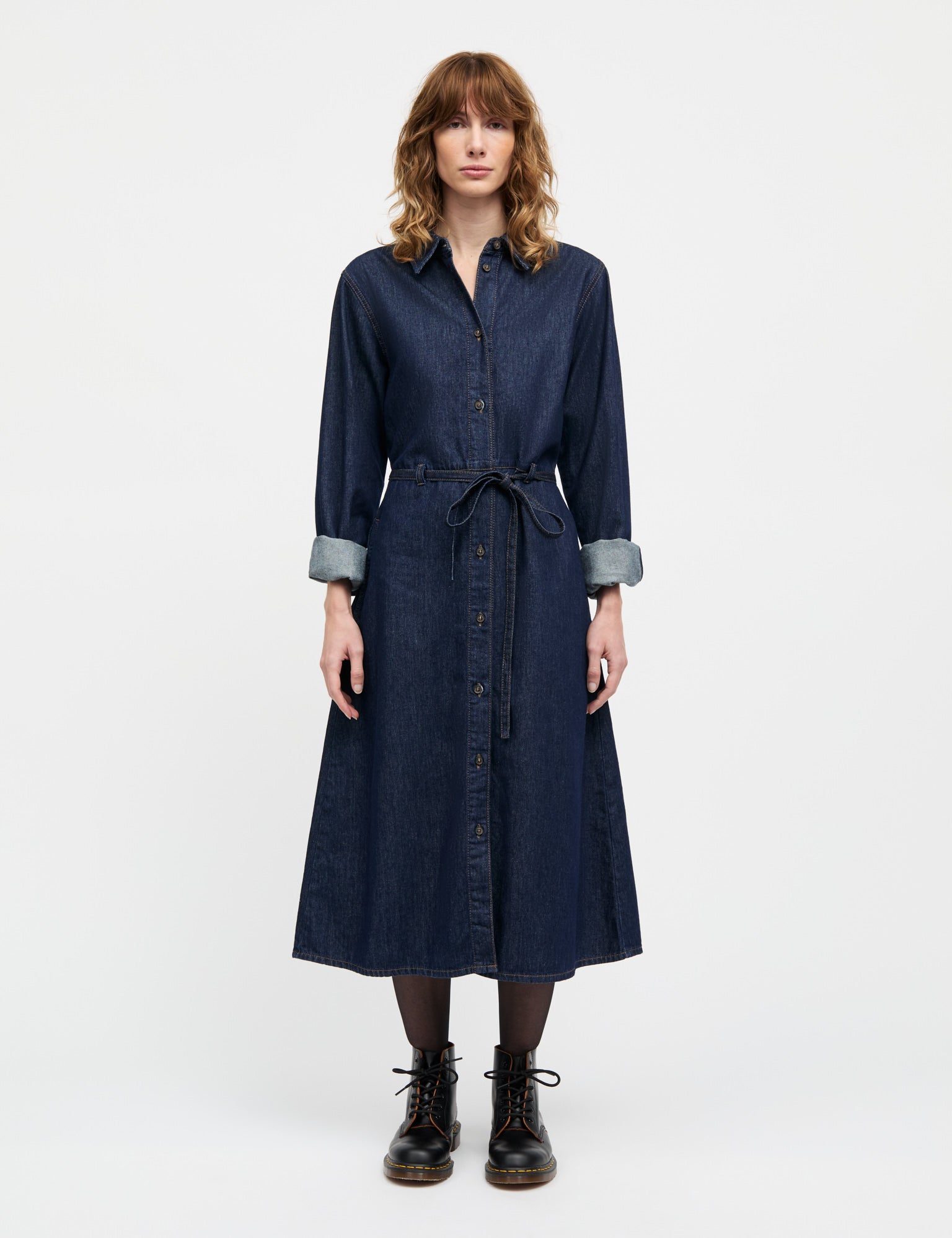 Calf-length shirt dress in soft and lightweight denim with an A-line shape, turn-down collar and tie belt at the waist.