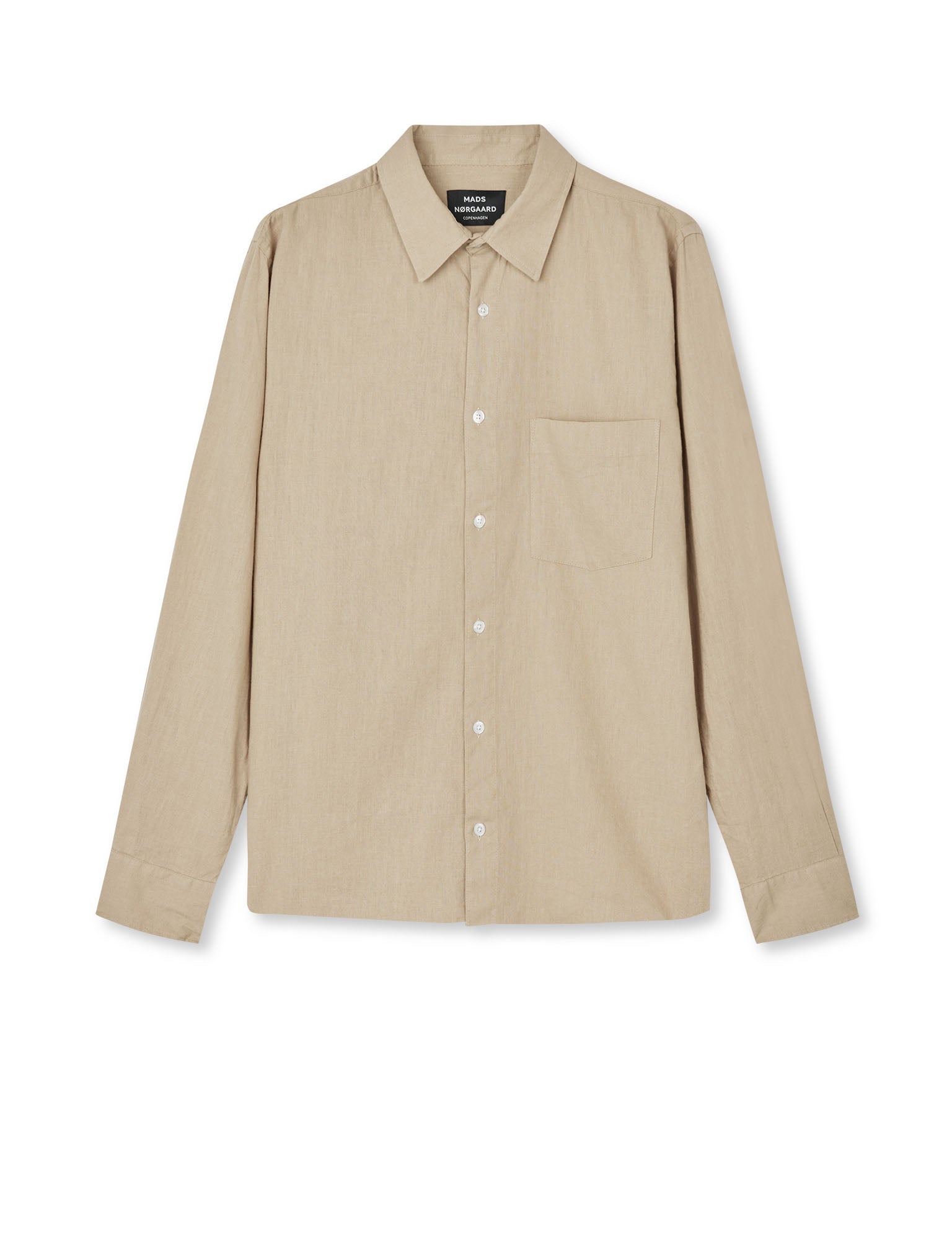 The Cotton Linen Sune is a sleek and stretchy shirt made of linen and cotton. The fit is regular, relatively straight up and down with small buttons and a button-down collar.