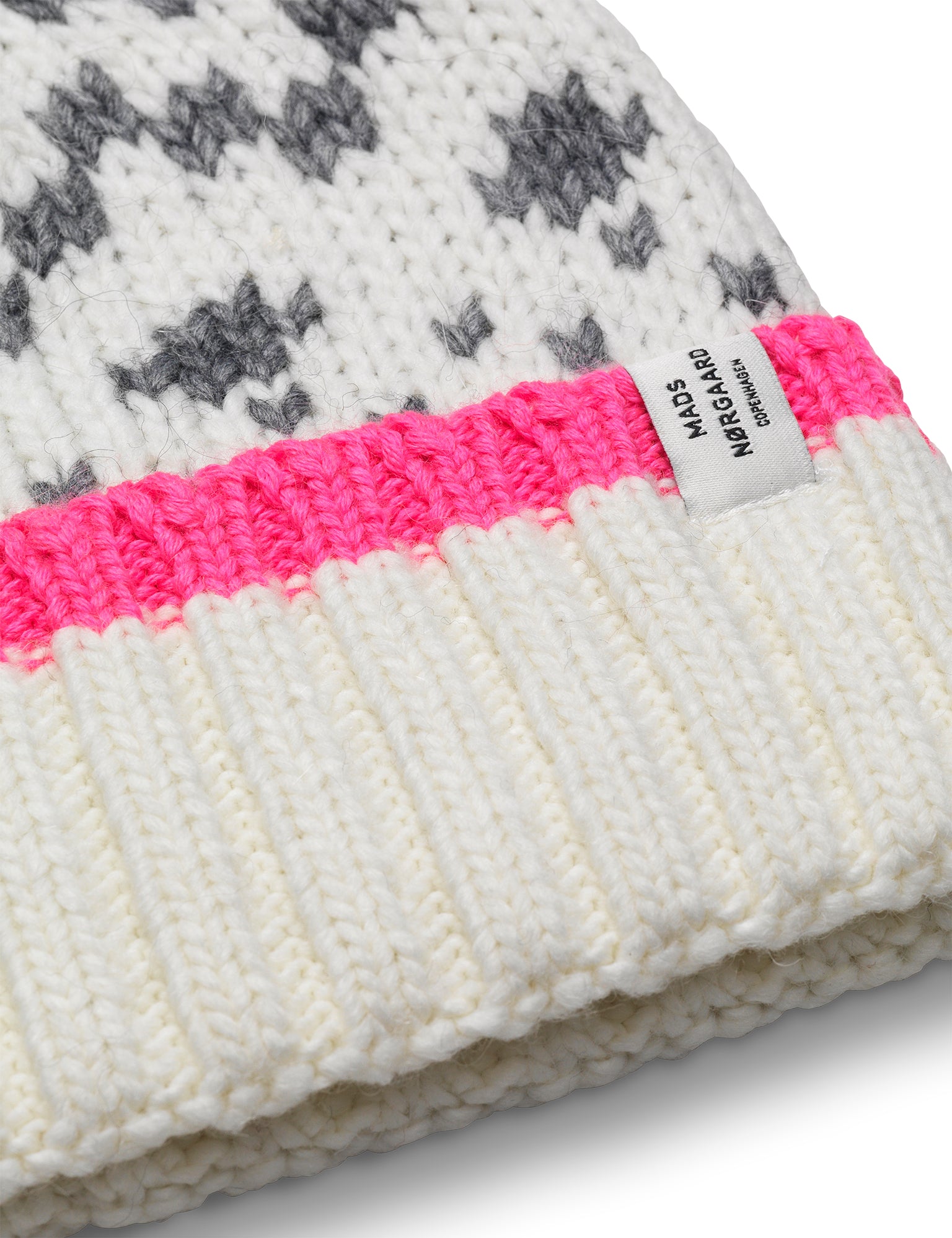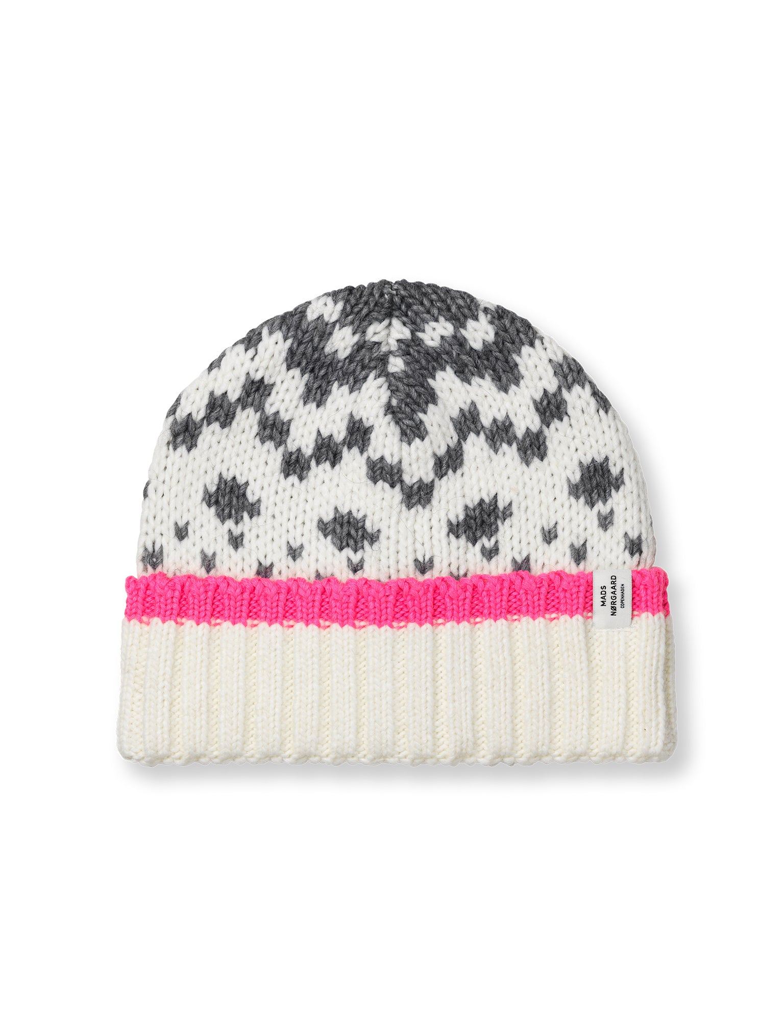 Soft and cosy knitted hat with a Scandinavian-inspired pattern and a contrast trim.