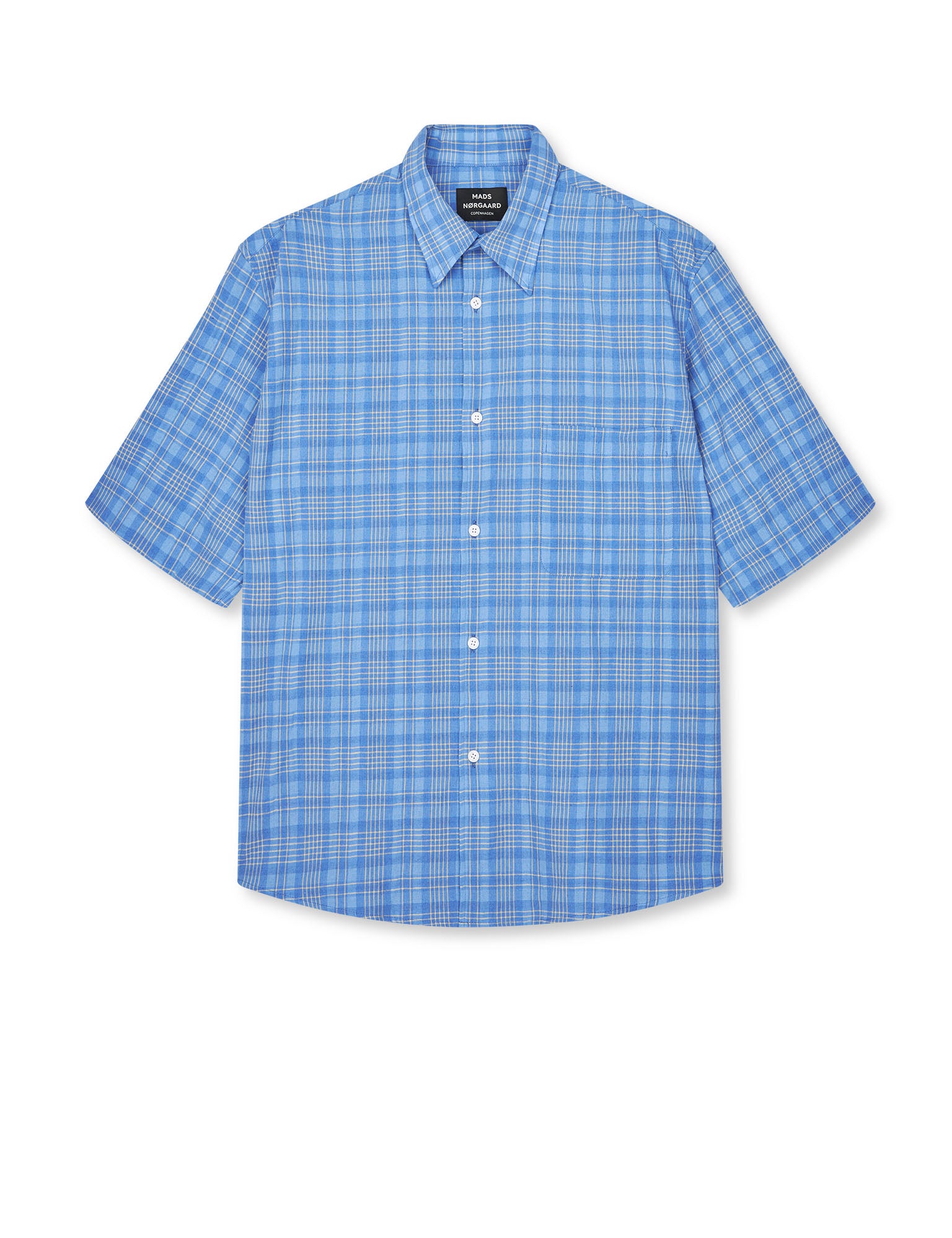 Short-sleeved, boxy shirt with a checked pattern, classic shirt collar and snap fastening at the front.
