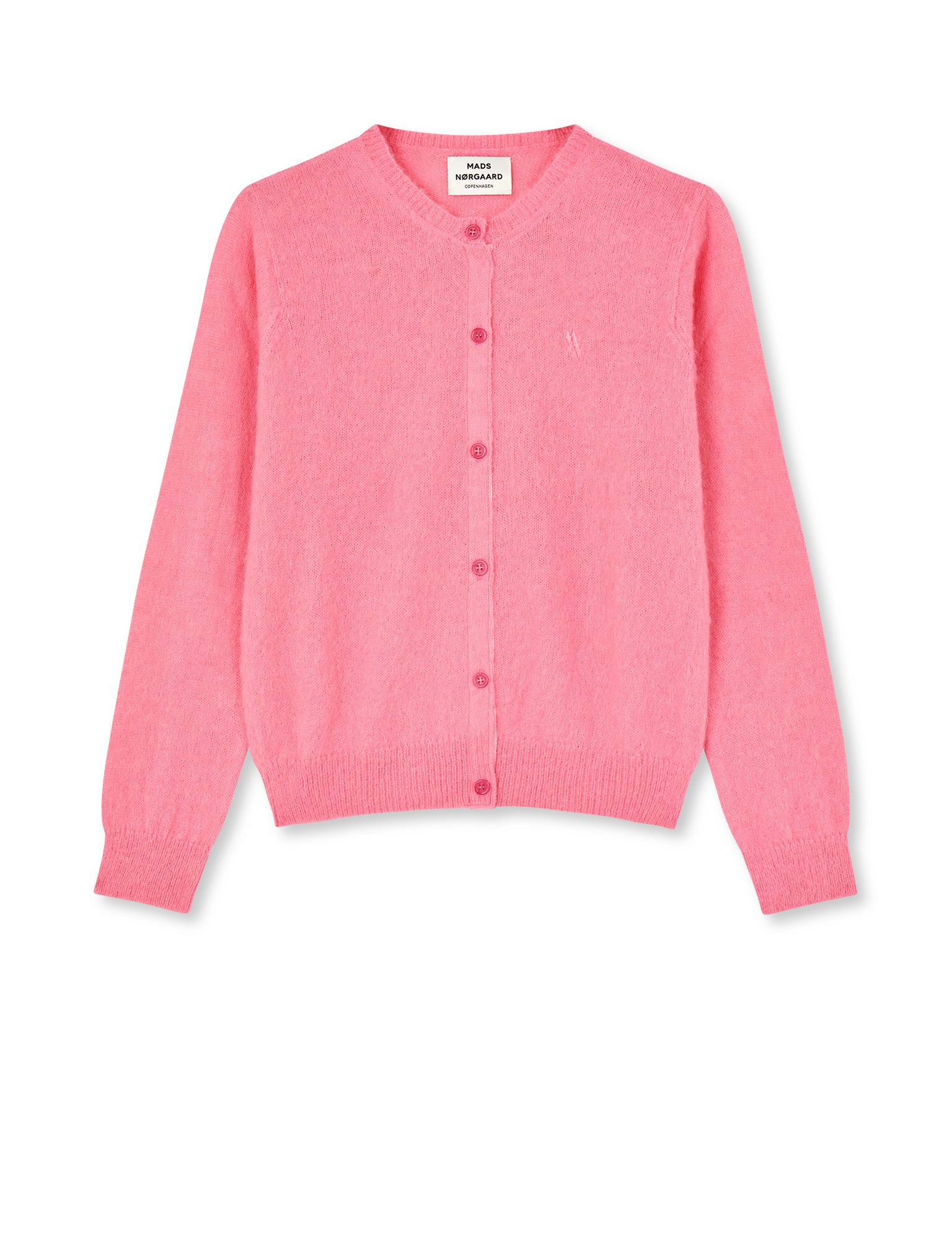 Soft and fluffy knitted cardigan with a round neck, small buttons, ribbed trim and embroidered mini logo.