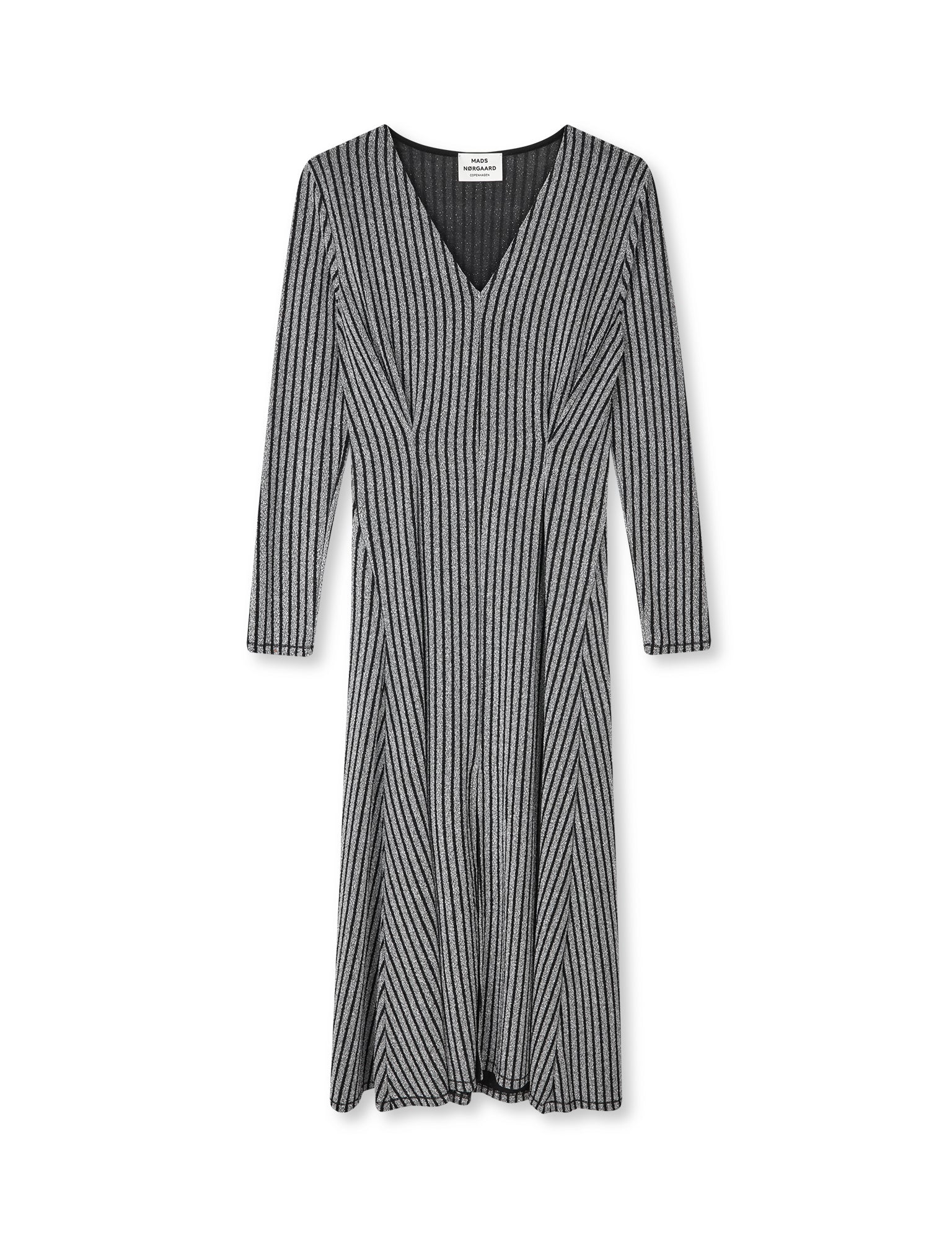 Glitter Jersey Valdis is a dress with a deep neck and seams at the waist. The fit is close-fitting but stretchy and has a wide hem.