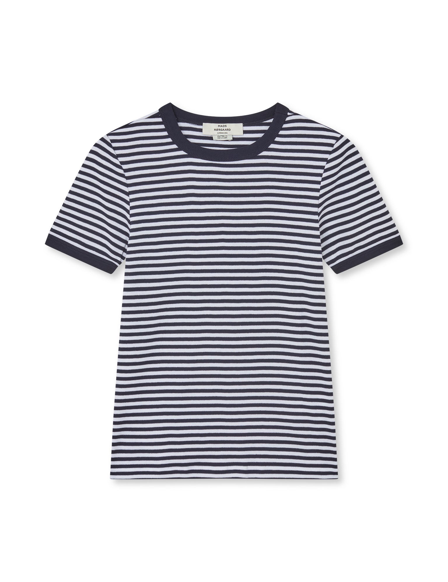 Simple, close-fitting T-shirt with a round neck, short sleeves and a smooth surface. This carefully crafted t-shirt is designed to fit and feel just right. Made from high quality long-fiber cotton, it has a soft touch and keeps its shape wash after wash. The fabric is knitted by one of the few remaining family-owned suppliers – and a longtime Mads Nørgaard favorite – located in Denmark. Here, the knitting tradition is carefully upheld and proudly kept local, with every step of production closely overseen. The t-shirt design is classic, with a stylish twist in detail, color, or stripe.