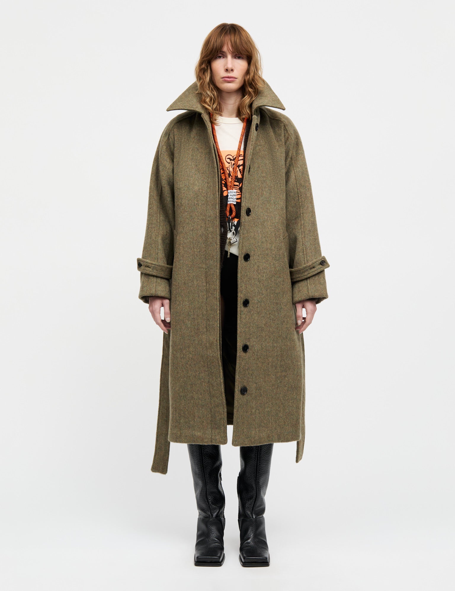 Loose-fitting long coat with large collar, concealed fastening, tie belt, distinctive welt pockets and trench coat sleeves.