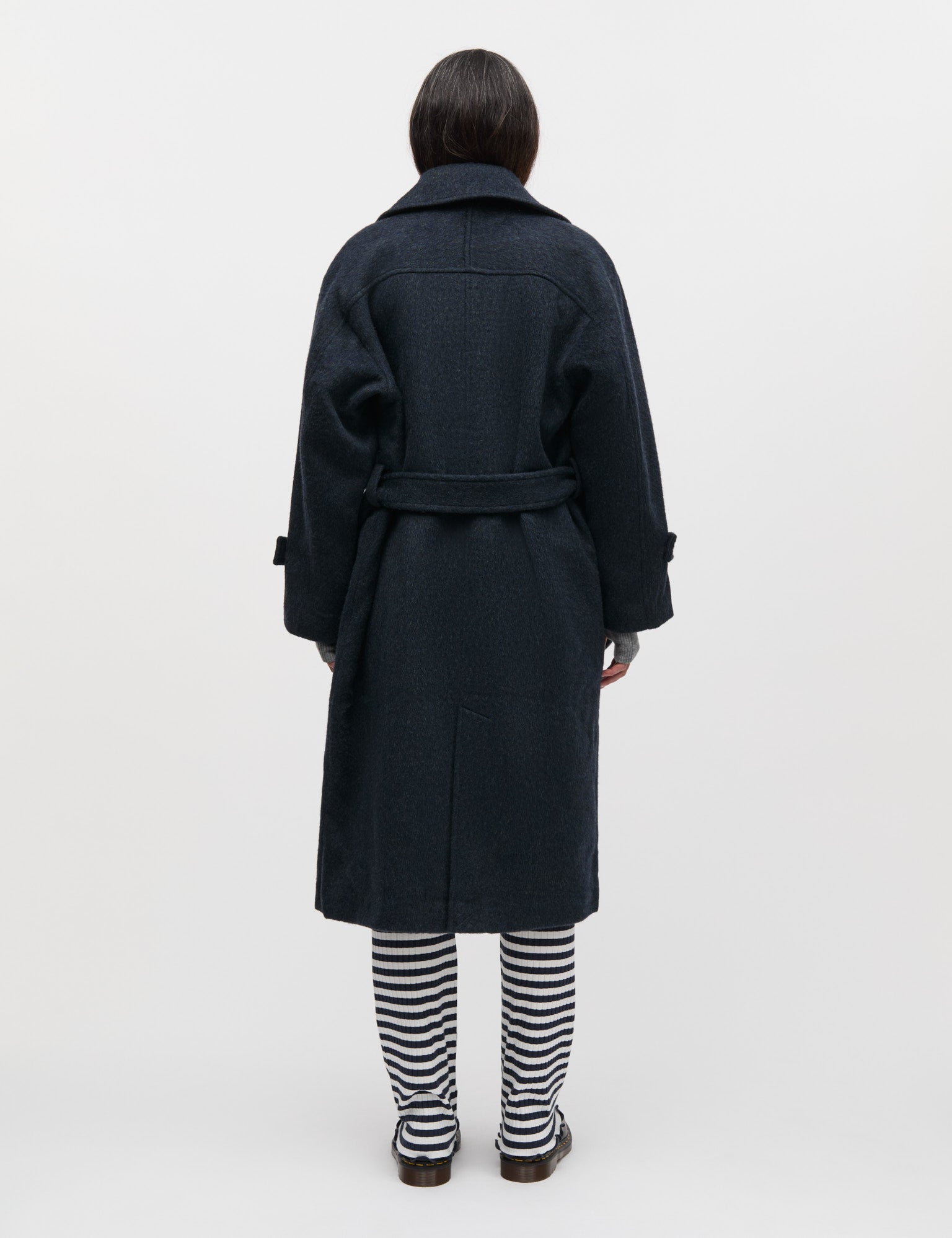 Loose-fitting long coat with large collar, concealed fastening, tie belt, distinctive welt pockets and trench coat sleeves.