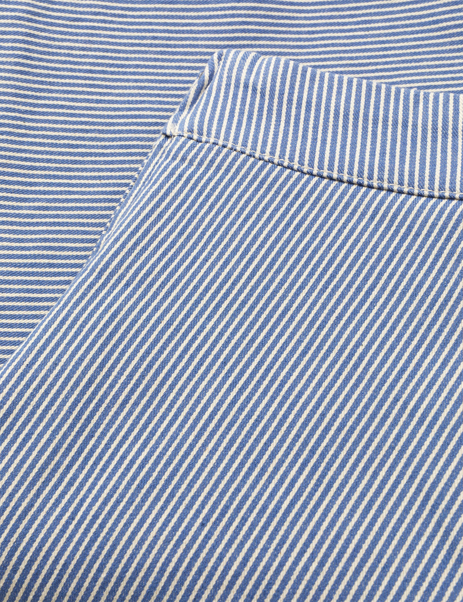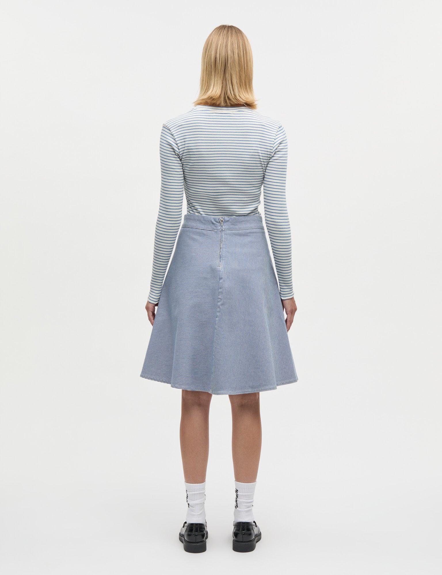 A-shaped denim skirt with a high waist, pockets and a fixed waistband with a zip at the back.