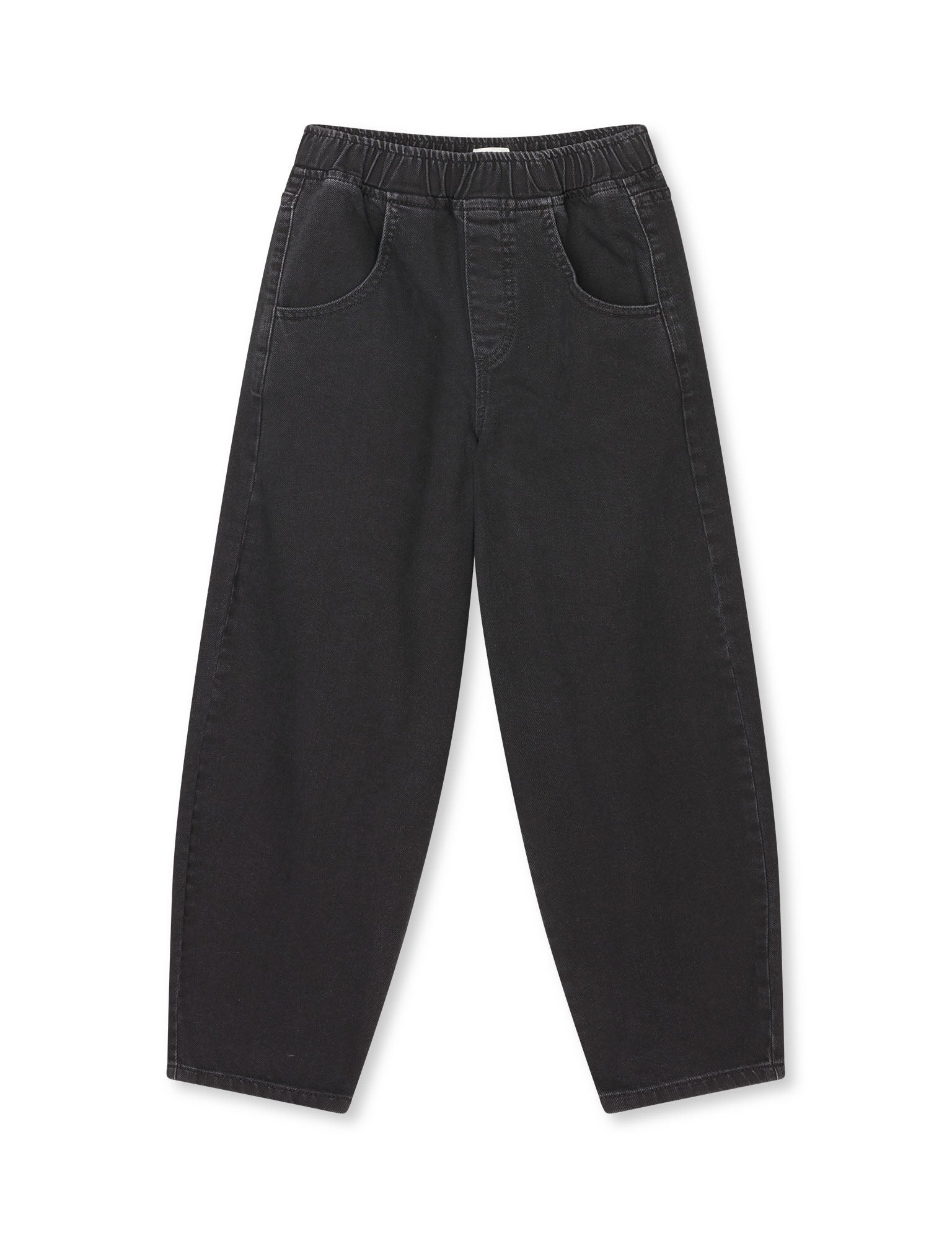 Barrel-leg jeans with elasticated waistband and front and back pockets.