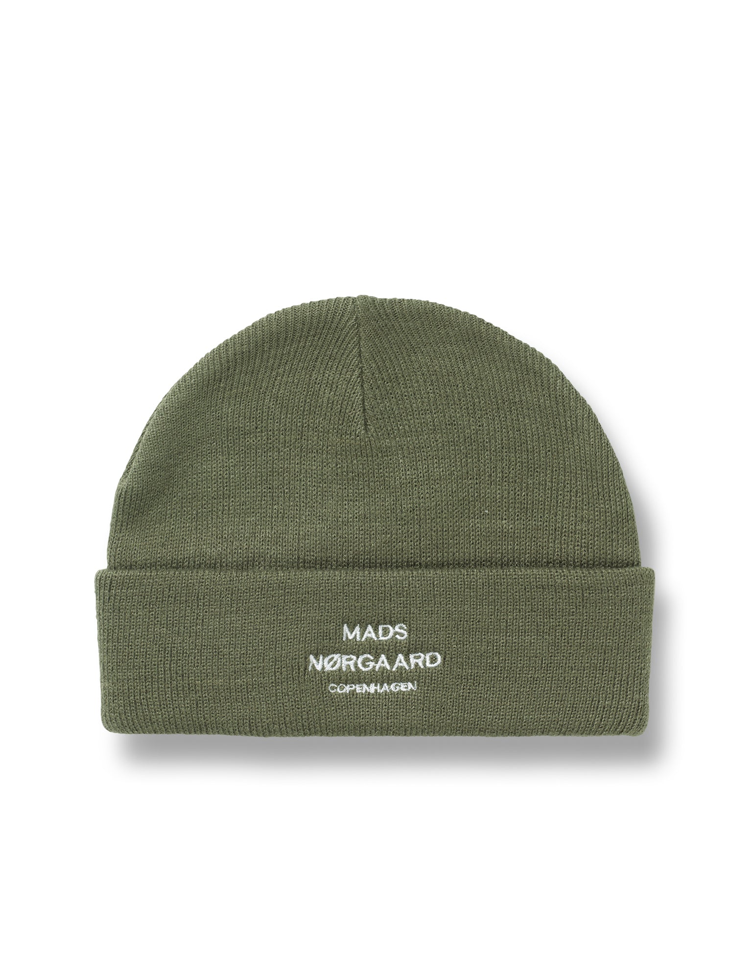 Smooth knitted beanie with a turn-up with small logo embroidered on it.