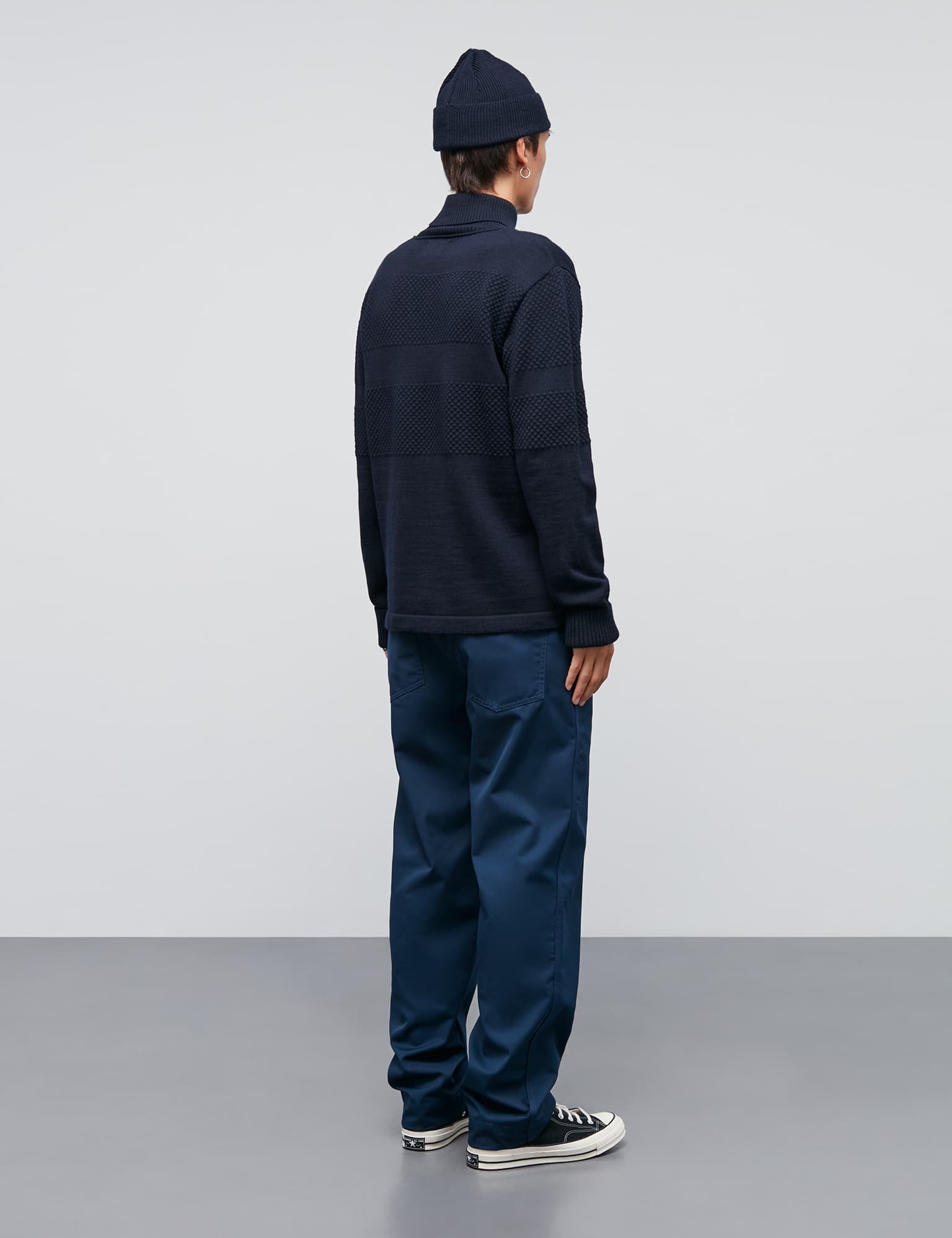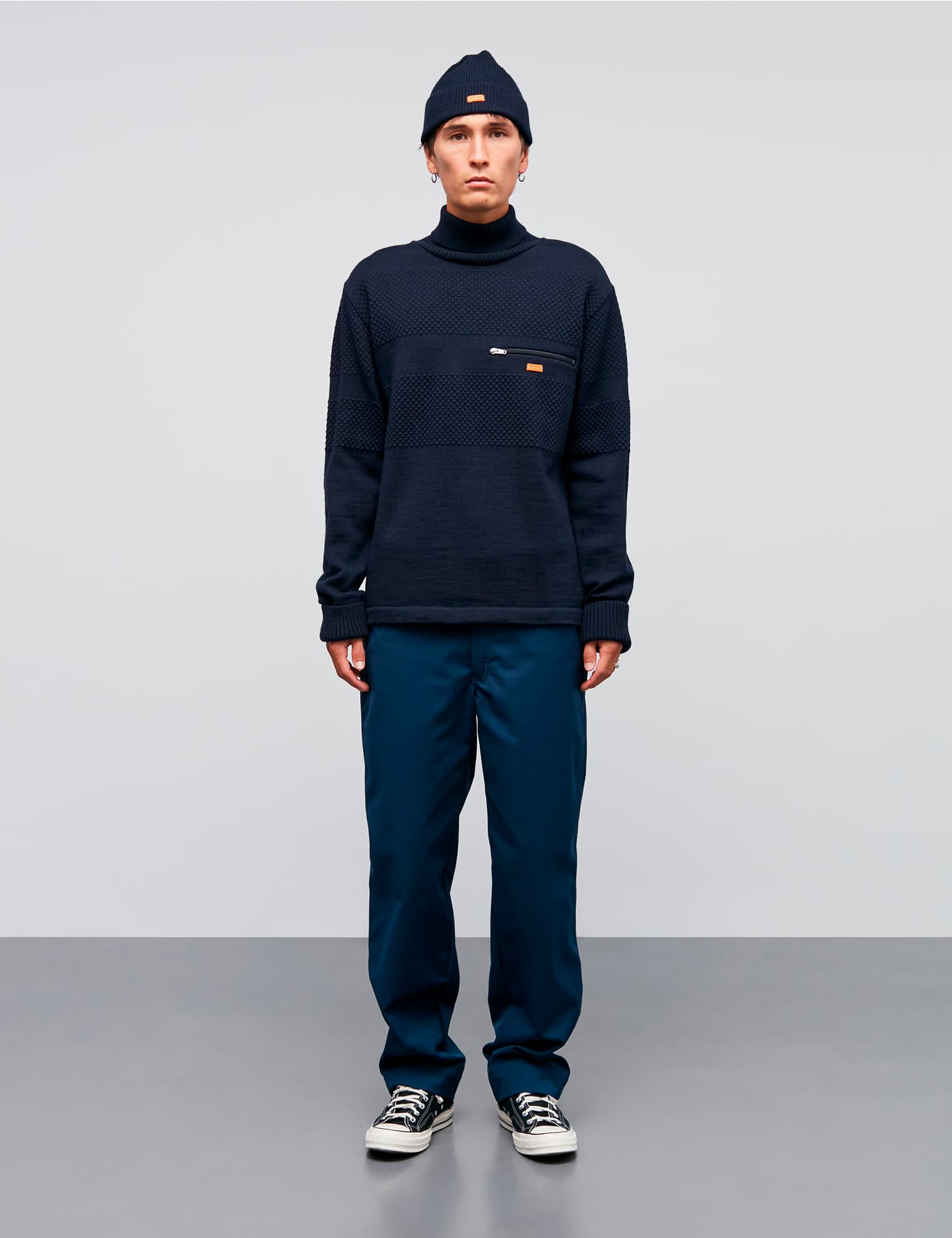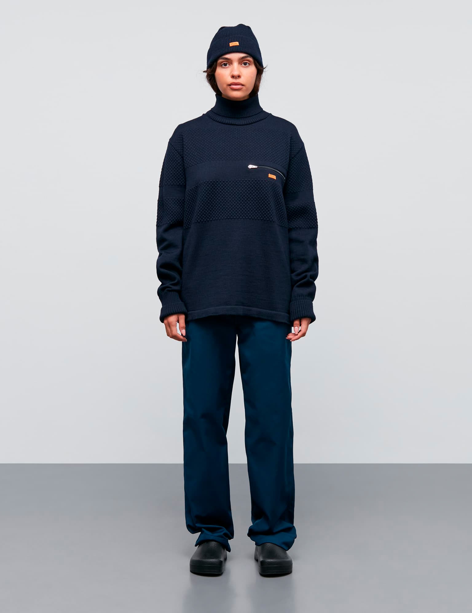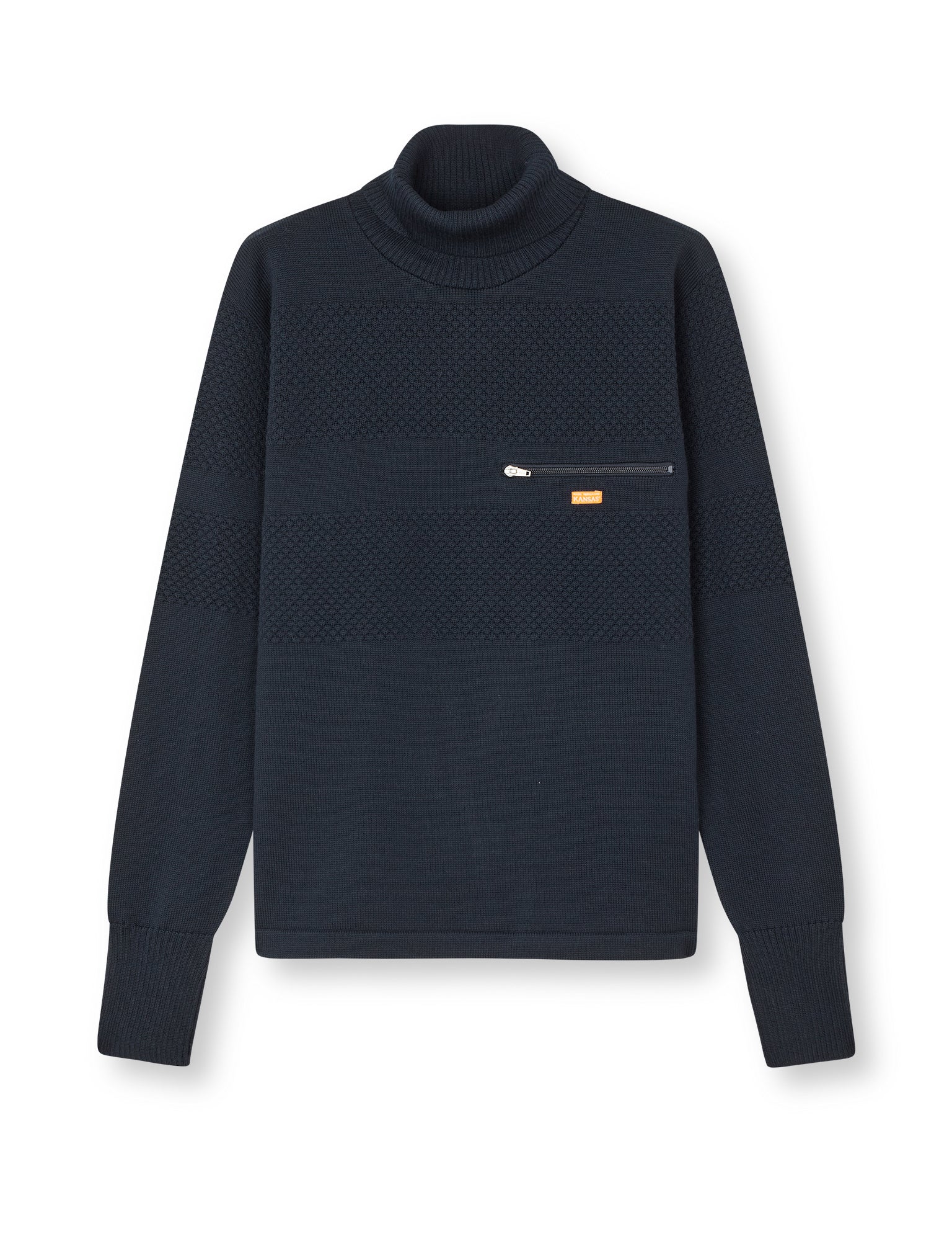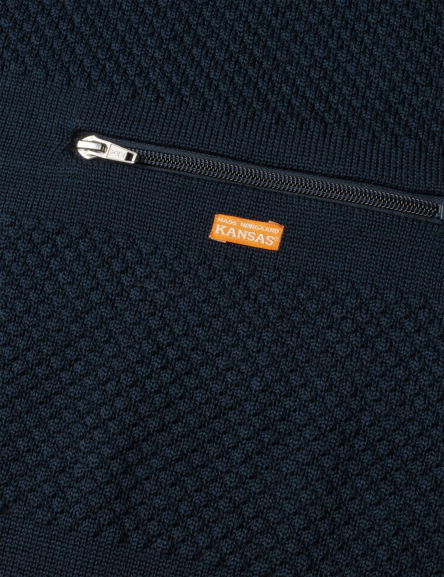 Kansas MN Wool Klemens Knit is knitted in a soft wool. The knit has a high neck and the fit is regular. Zipper on one chest and a small orange logo. The models wear size L.