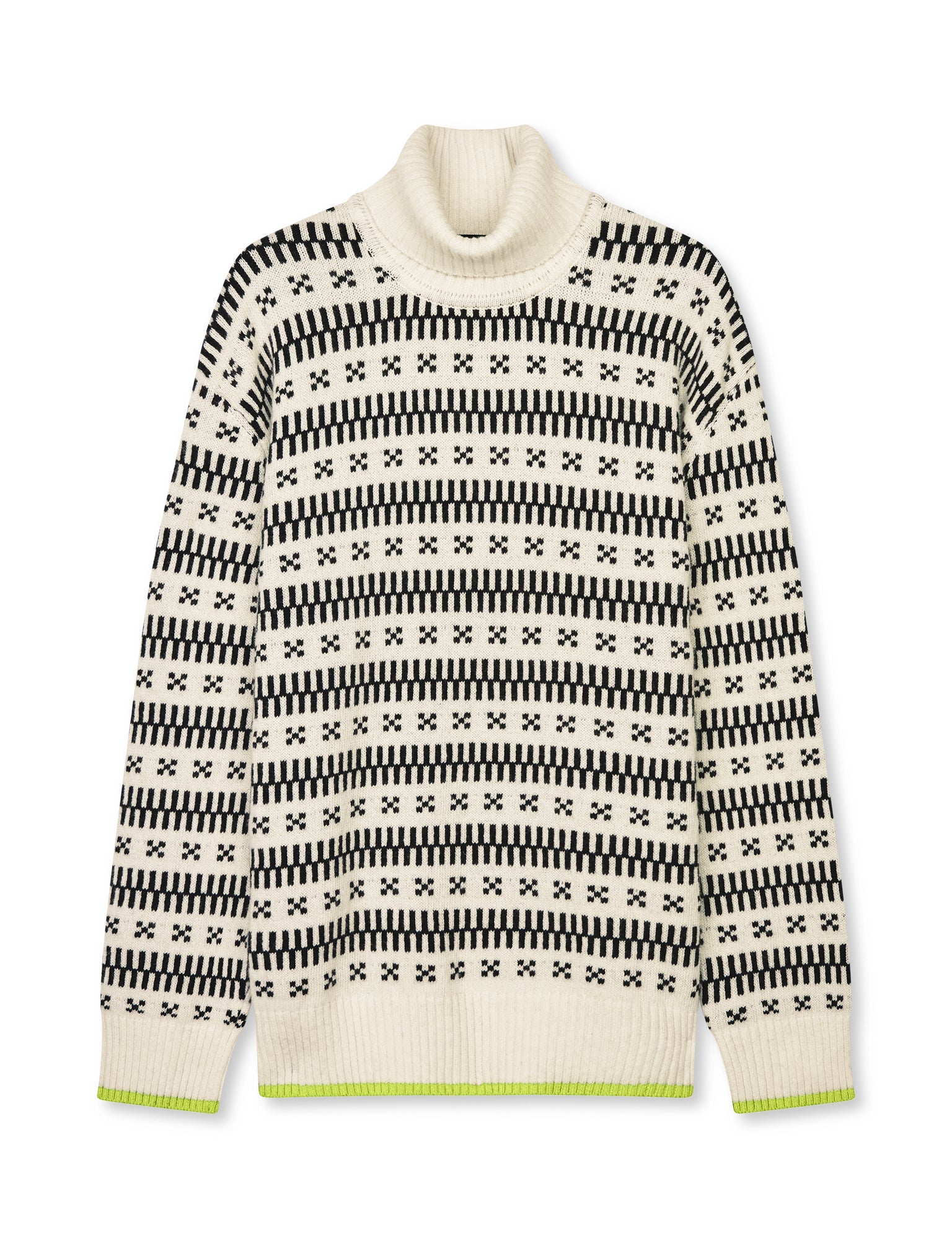 Heavy and boxy knitted sweater with dropped shoulders, turtleneck, a Nordic-inspired pattern and neon trim.