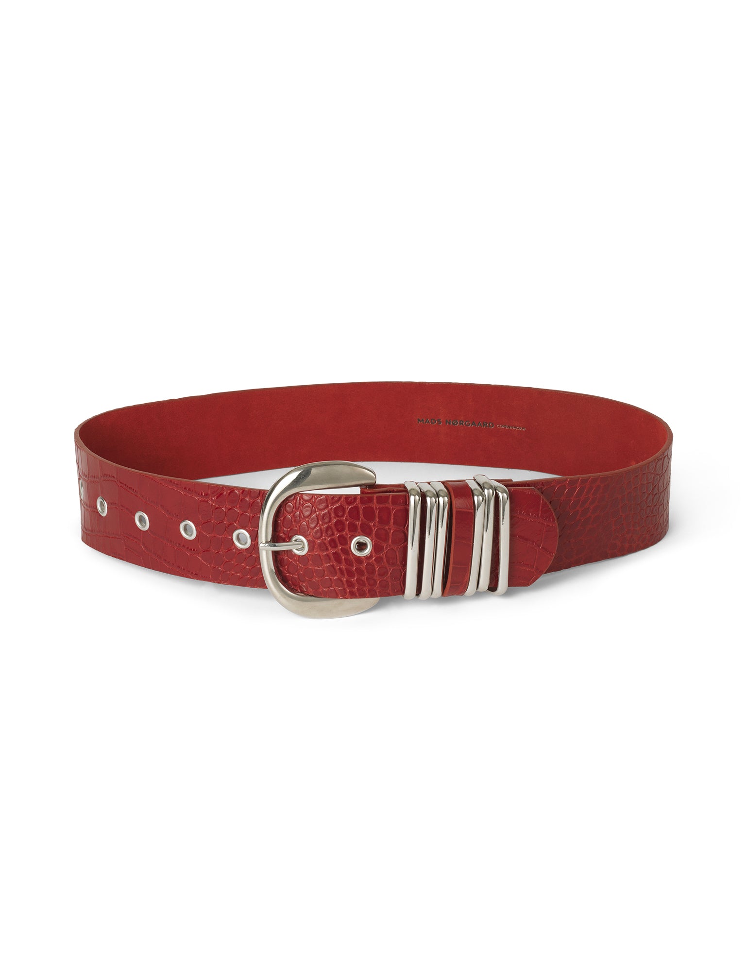 Reptile-print embossed leather belt with metal straps and curved belt buckle.
