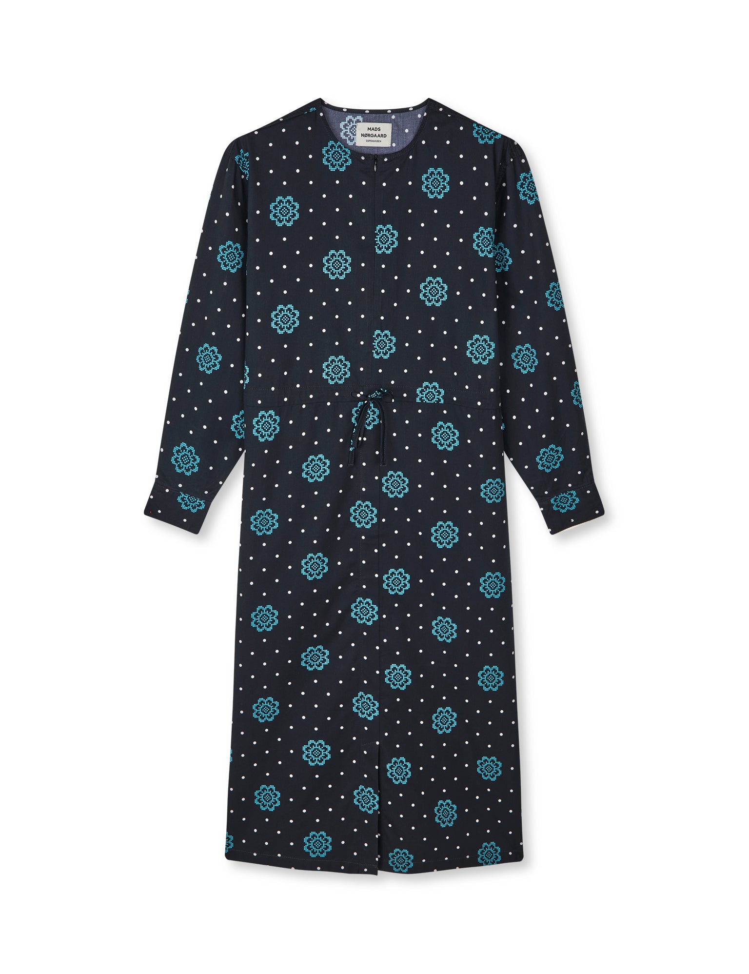 Leo Twill Asa is a printed dress made from a soft cotton. The dress has a front zipper and a tie at the waist. The fit is boxy and the length goes below the knee.