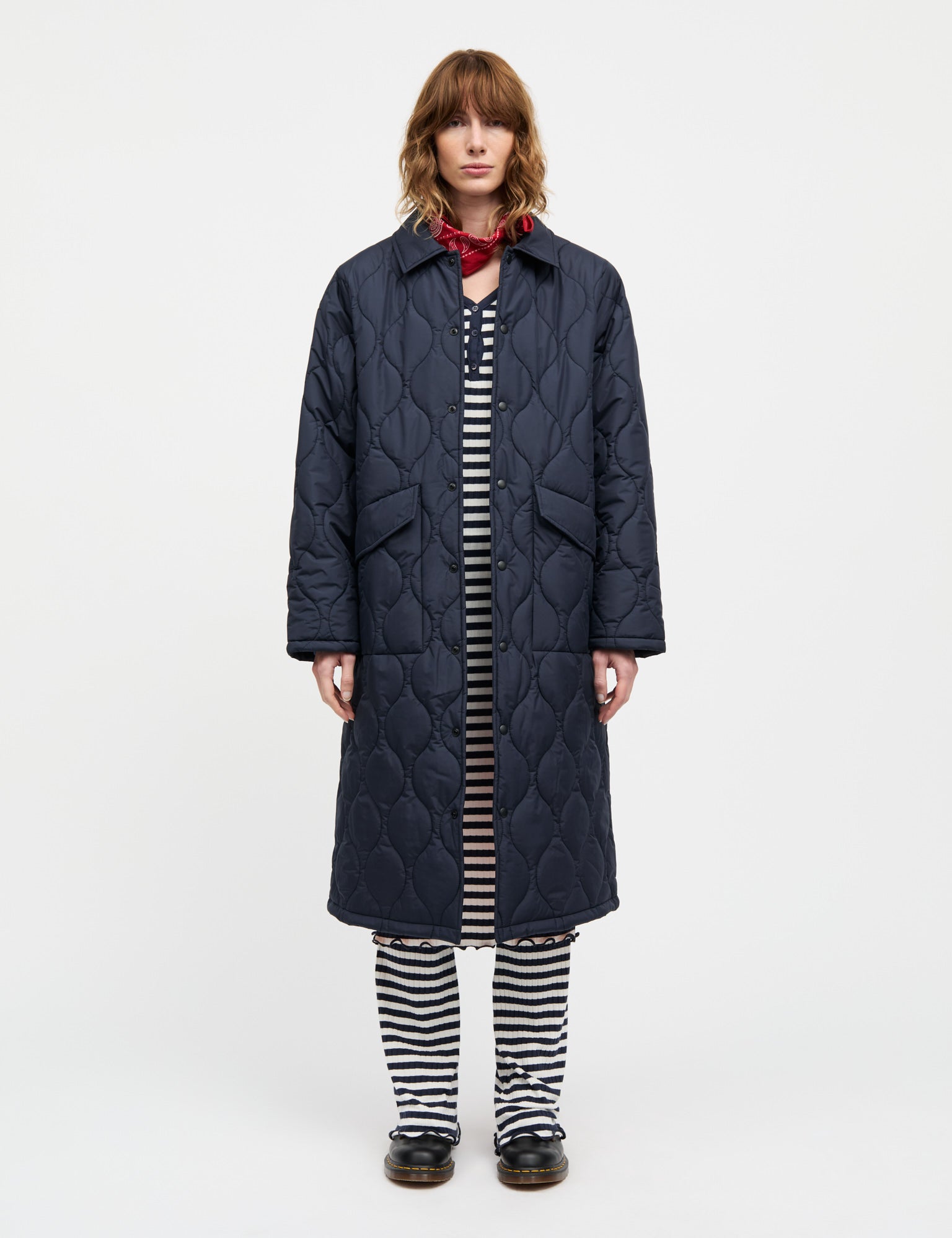 Boxy and water-repellent thermal coat with buttons, cut-away collar and large exterior pockets.