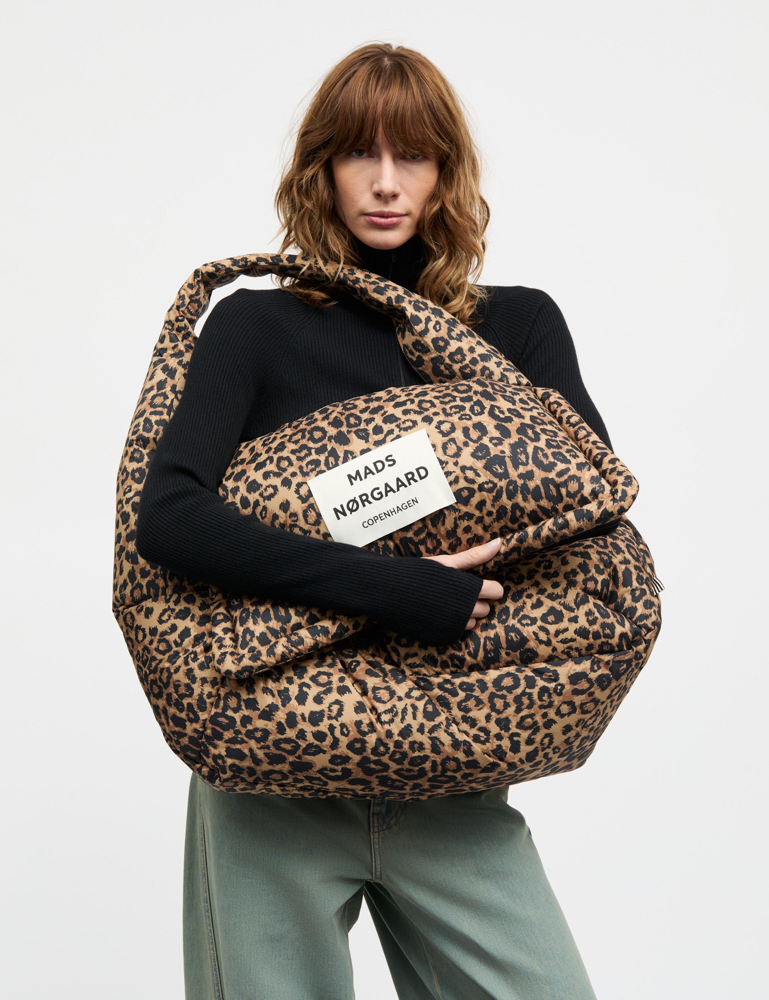 Bag with leopard print and a puffy look. Shoulder strap and logo label on the front. One large inner compartment with a small side pocket.