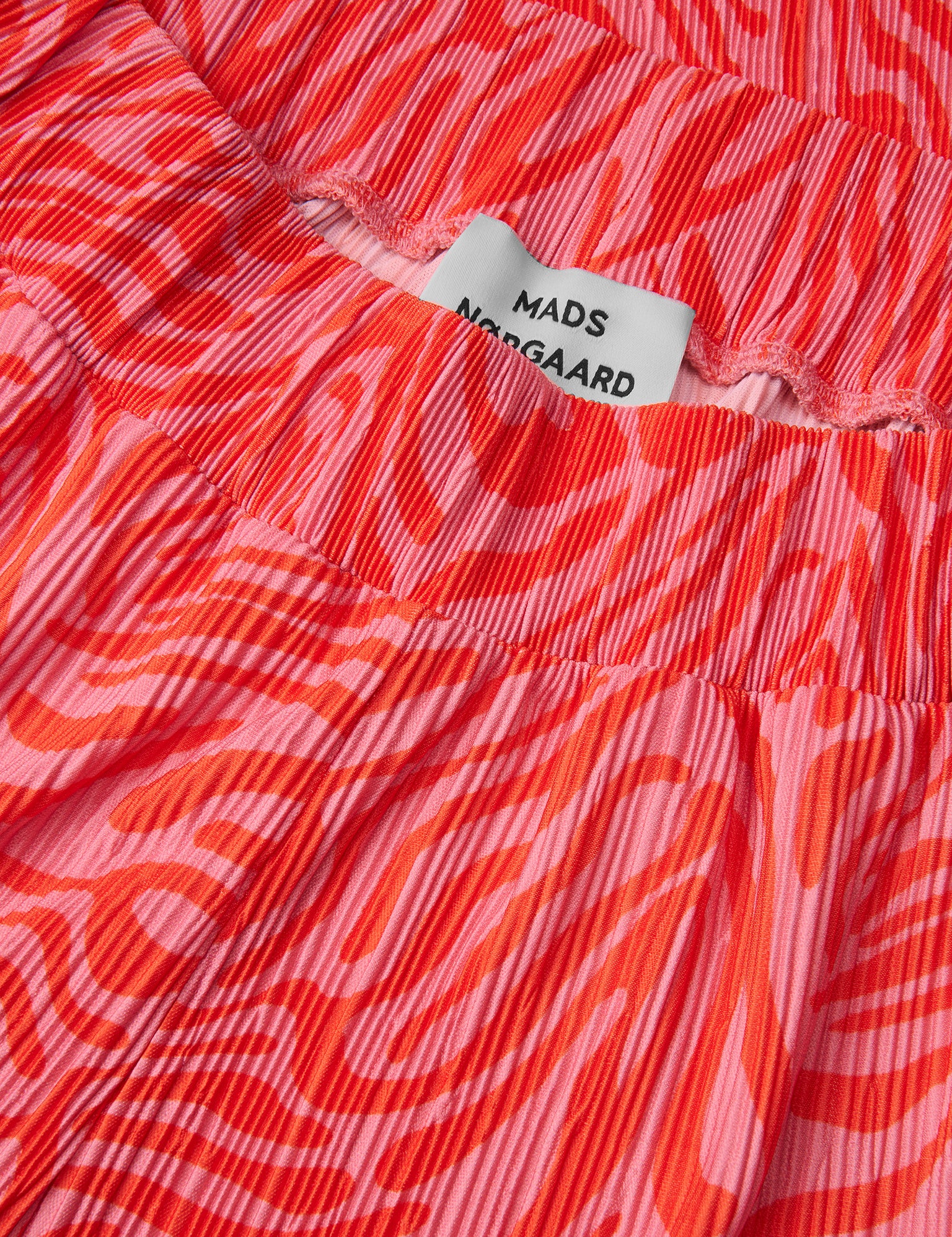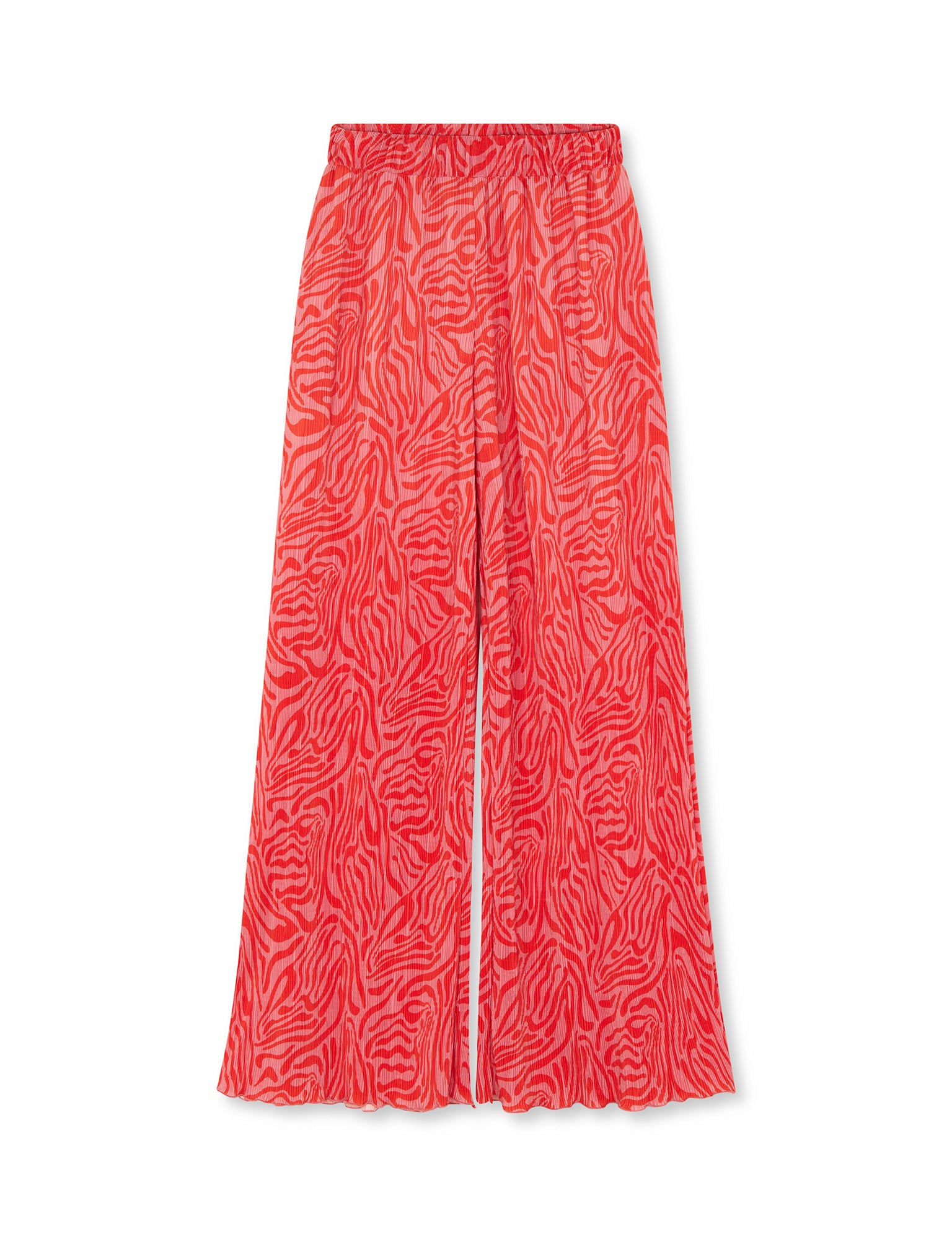 Our pants Luno Velo Pants AOP is made of 50 % recycled polyester and 50 % polyester that is woven into a lightly shiny, plissé fabric. The fit is relaxed with a high waist, an elastic waistband and super wide legs that dance around and touch the the floor.