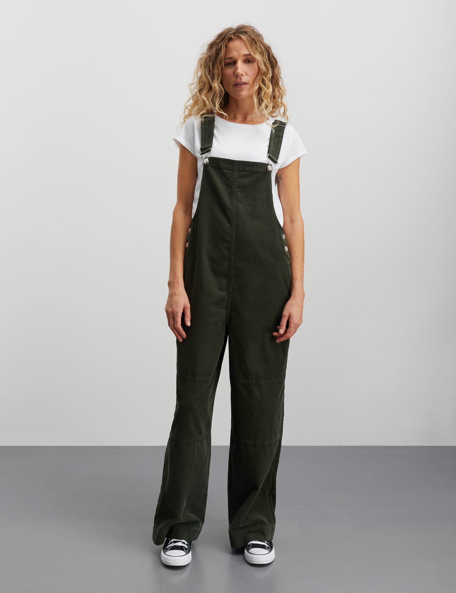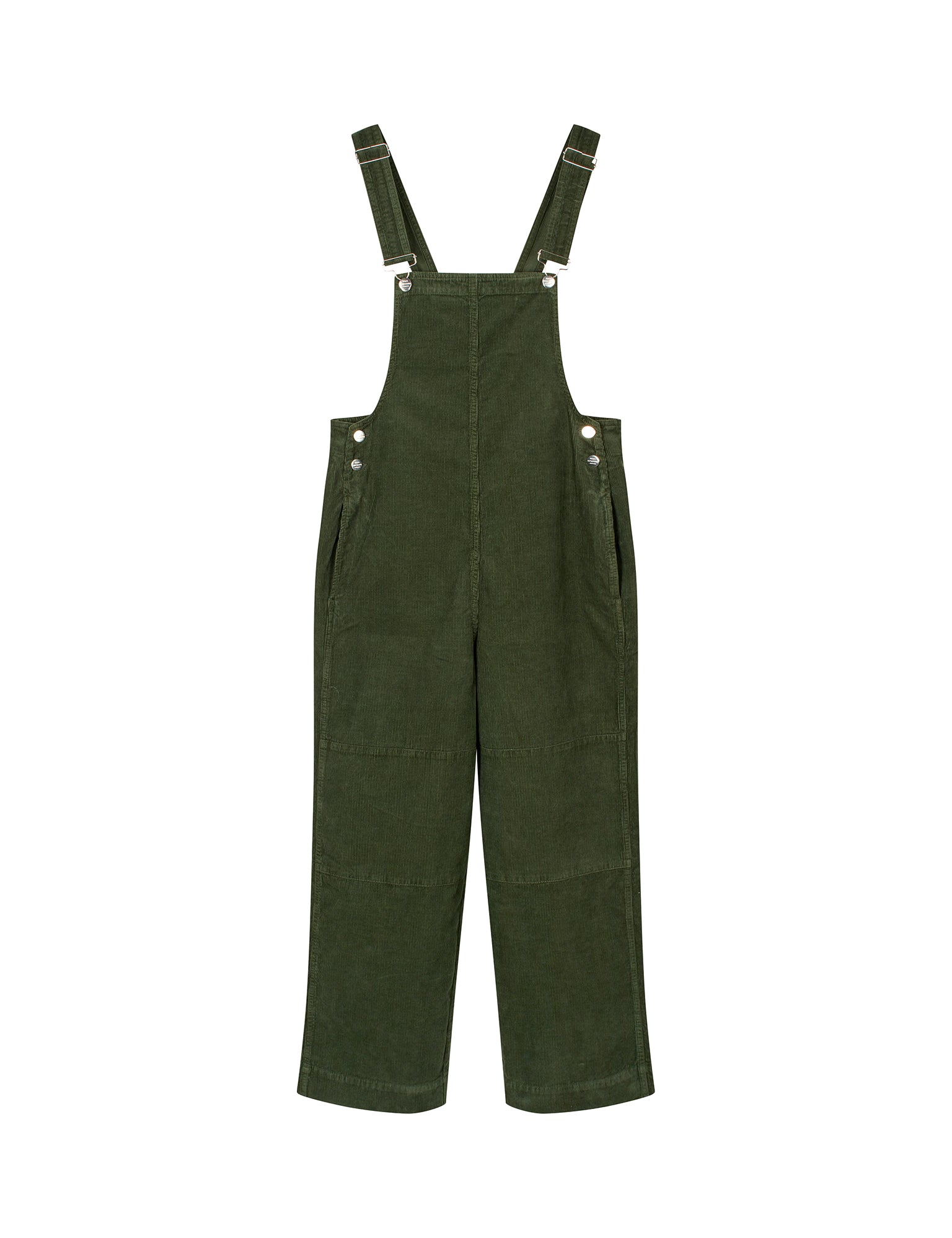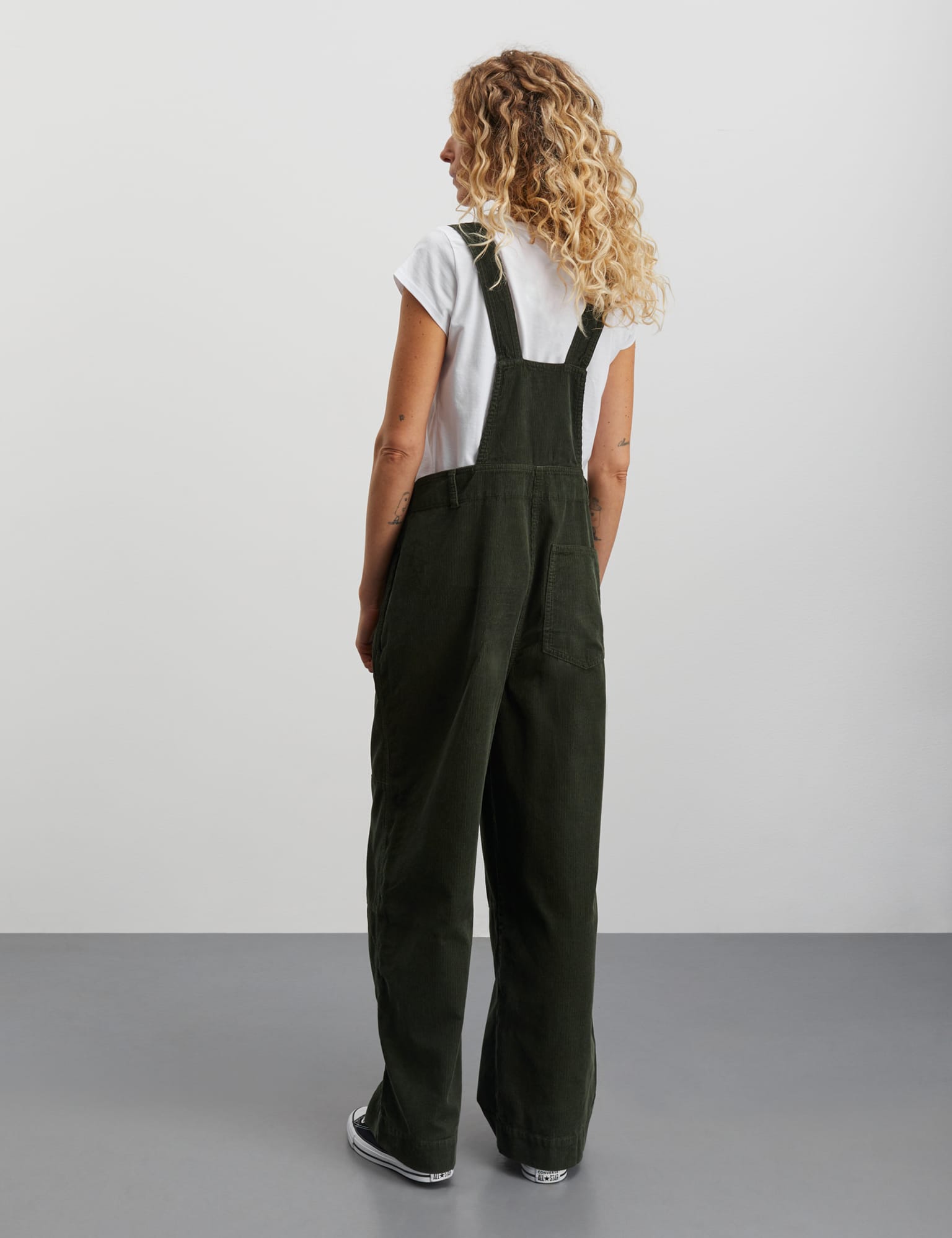 Mini Cord Finn Overalls are a pair of wide-legged overalls in corduroy. They have long straps, a relatively low front and back, buttons and side pockets.