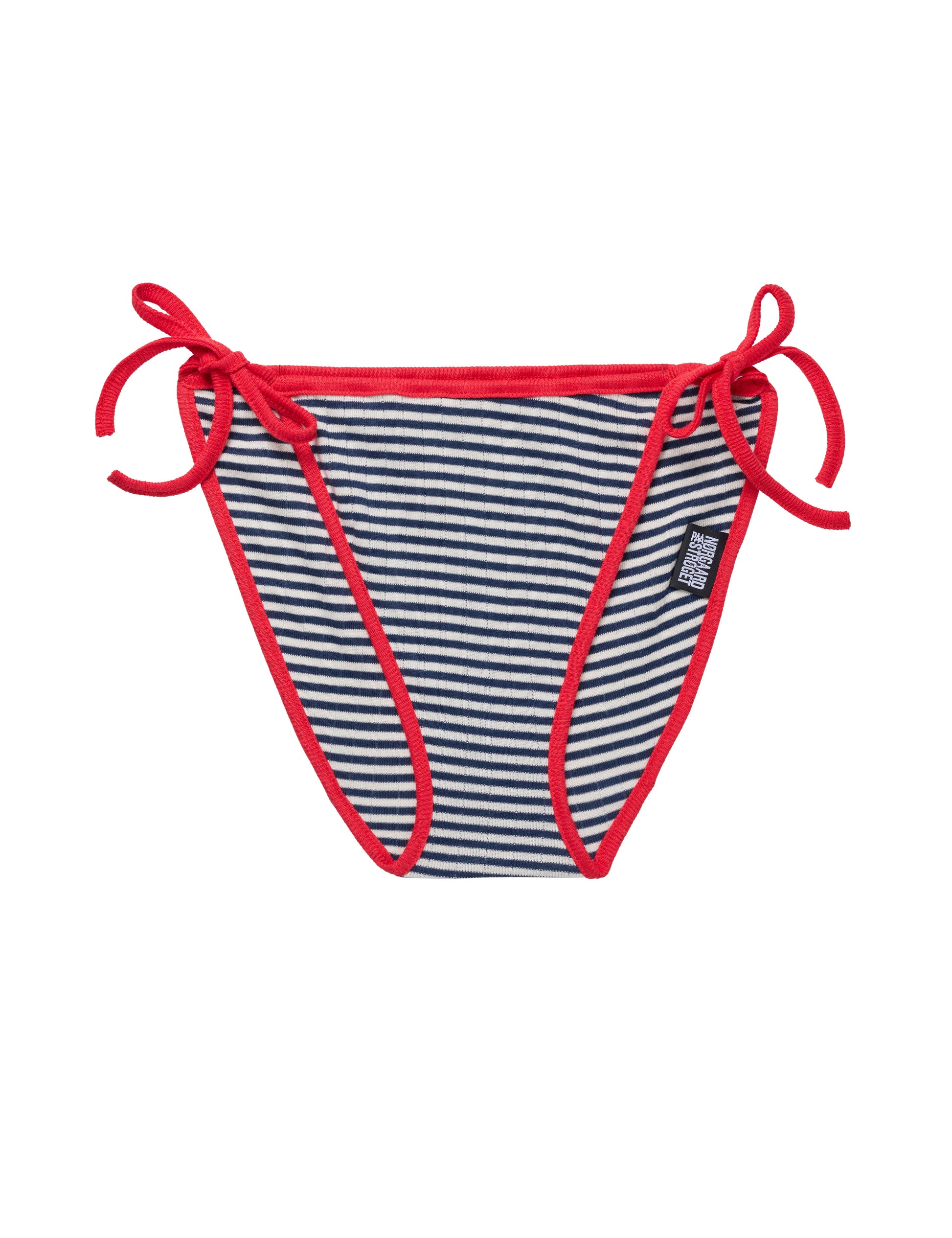The NPS bikini bottom is inspired by and made from the same fabric as the original striped #101 T-shirt, featuring alternating wide and narrow stripes. Nørgaard paa Strøget’s NPS bikini bottom is a further development of the classic #101 T-shirt, designed by Jørgen Nørgaard in 1967. It is knitted, dyed, and sewn in Denmark, and made from 100% BCI cotton.