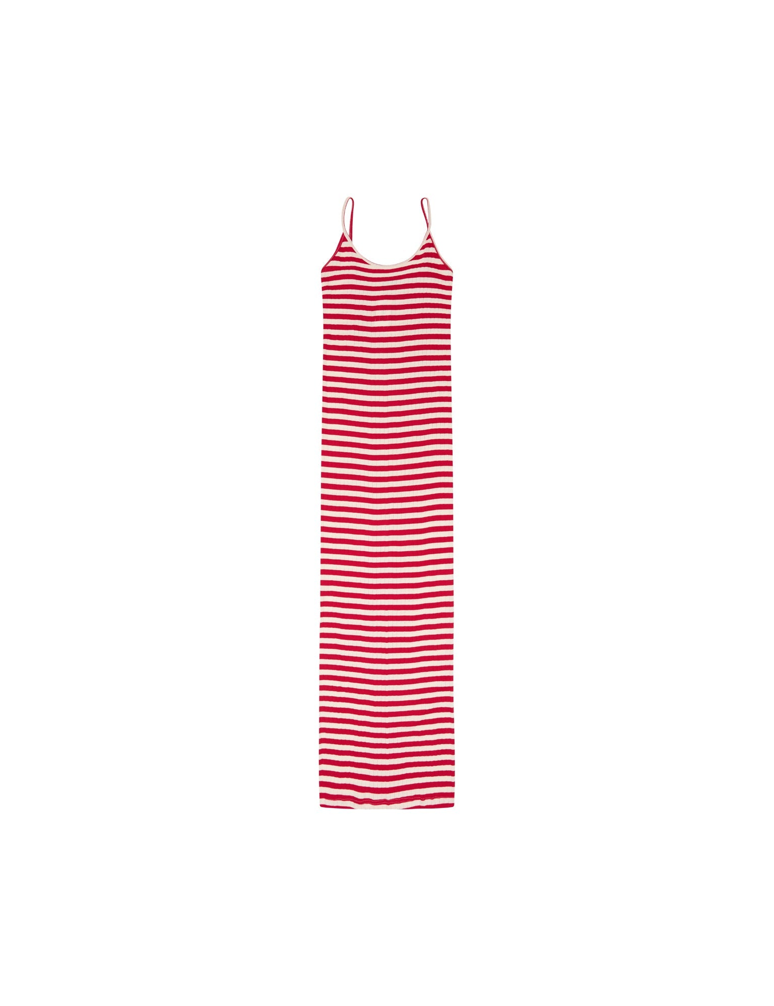 NPS Broadway Strap Dress is an ankle-long dress with thin shoulder straps based on the design of the classic NPS #101 t-shirt. The color of this version is striped yellow and rose. The NPS Slip Dress is a redesign of the classic NPS #101 t-shirt designed by Jørgen Nørgaard in 1967. The dress was first designed back in the 90’s and is still knitted and sown in Denmark from 100% bci cotton. The Slip Dress is one-size