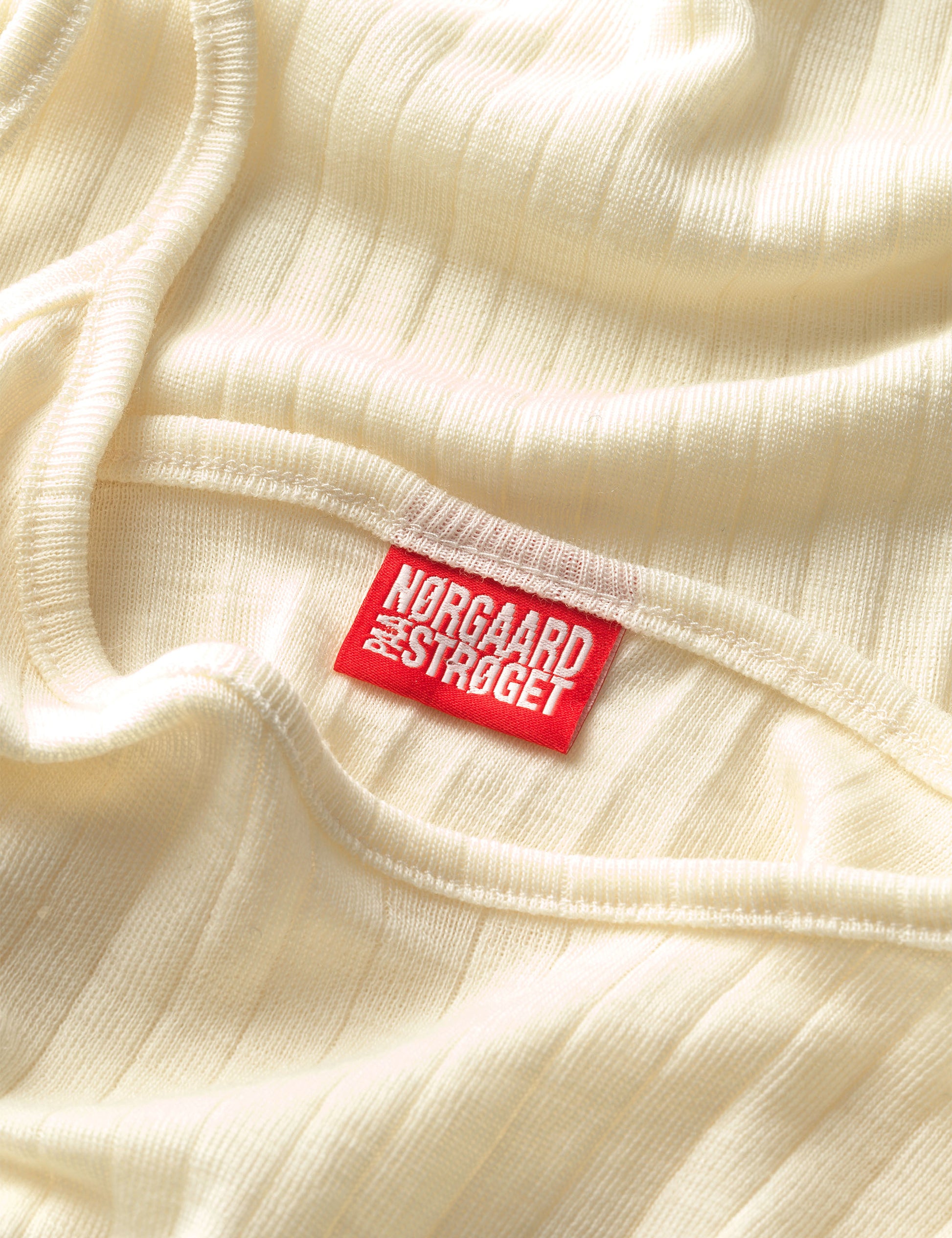 NPS Strap Top Wool is the classic #101 T-shirt designed as a top with thin shoulder straps in wool. The Nørgaard paa Strøget top is a further development of the classic #101 T-shirt designed by Jørgen Nørgaard in 1967. The top was designed in the 90's and is knitted and sewn in Denmark from 100% wool. The top is one size.