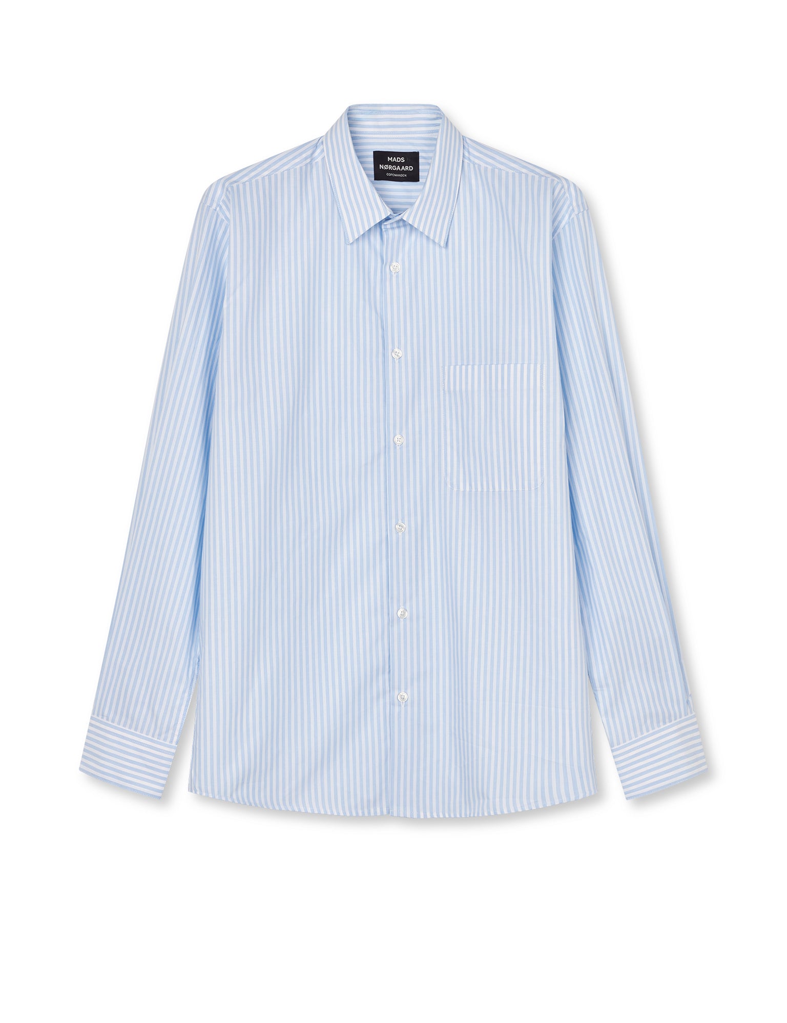 The Prime Cotton Poplin Sune is a crisp cotton shirt. The fit is regular, relatively straight up and down with small buttons, narrow stripes and a button-down collar.