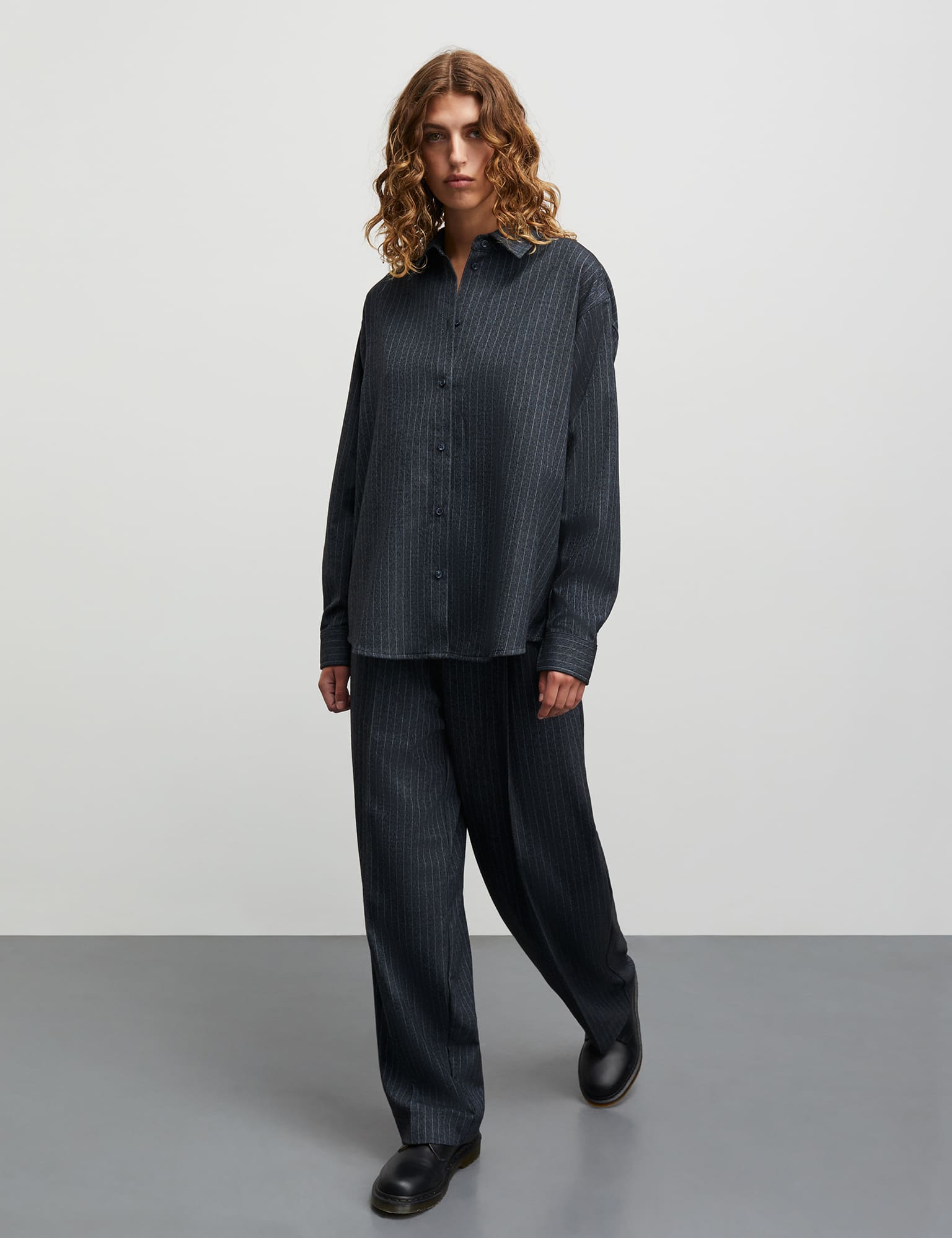 Pinstripe Melange Cruelly is a simple, oversized shirt with small buttons, cuffs, a classic collar and pinstripes.