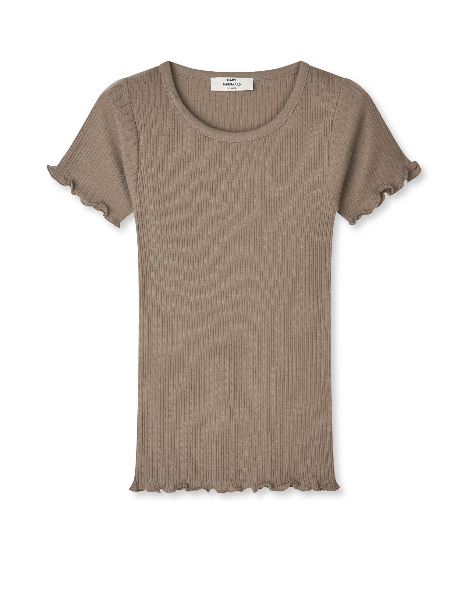Fitted ribbed T-shirt with short sleeves, rounded neckline and wavy edge at the sleeves and bottom hem.