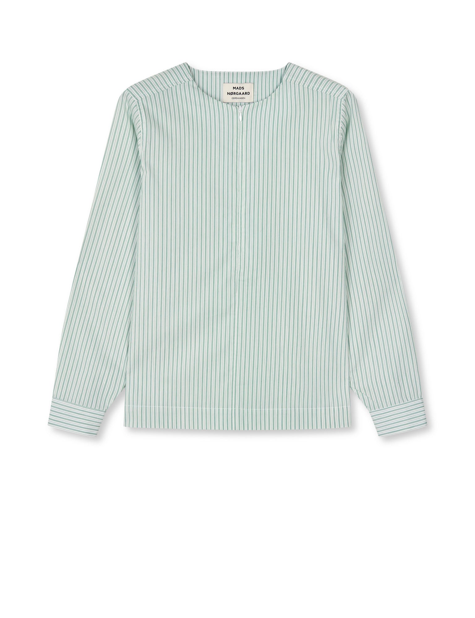 The Poplinda Dana blouse hides a zipper at the neck, is straight up and down and has cuffs in the long sleeves.