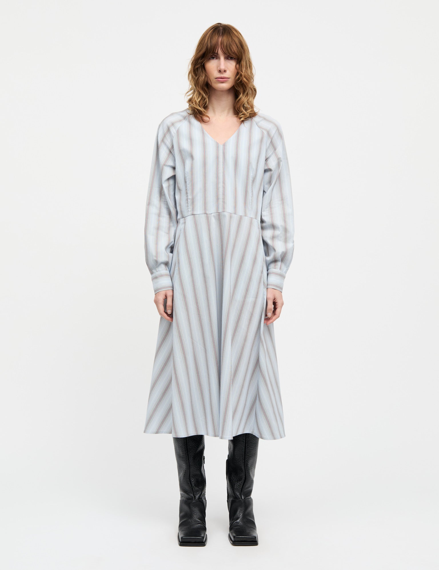 Calf-length dress with long cuffed sleeves, A-line shape and V-neck.