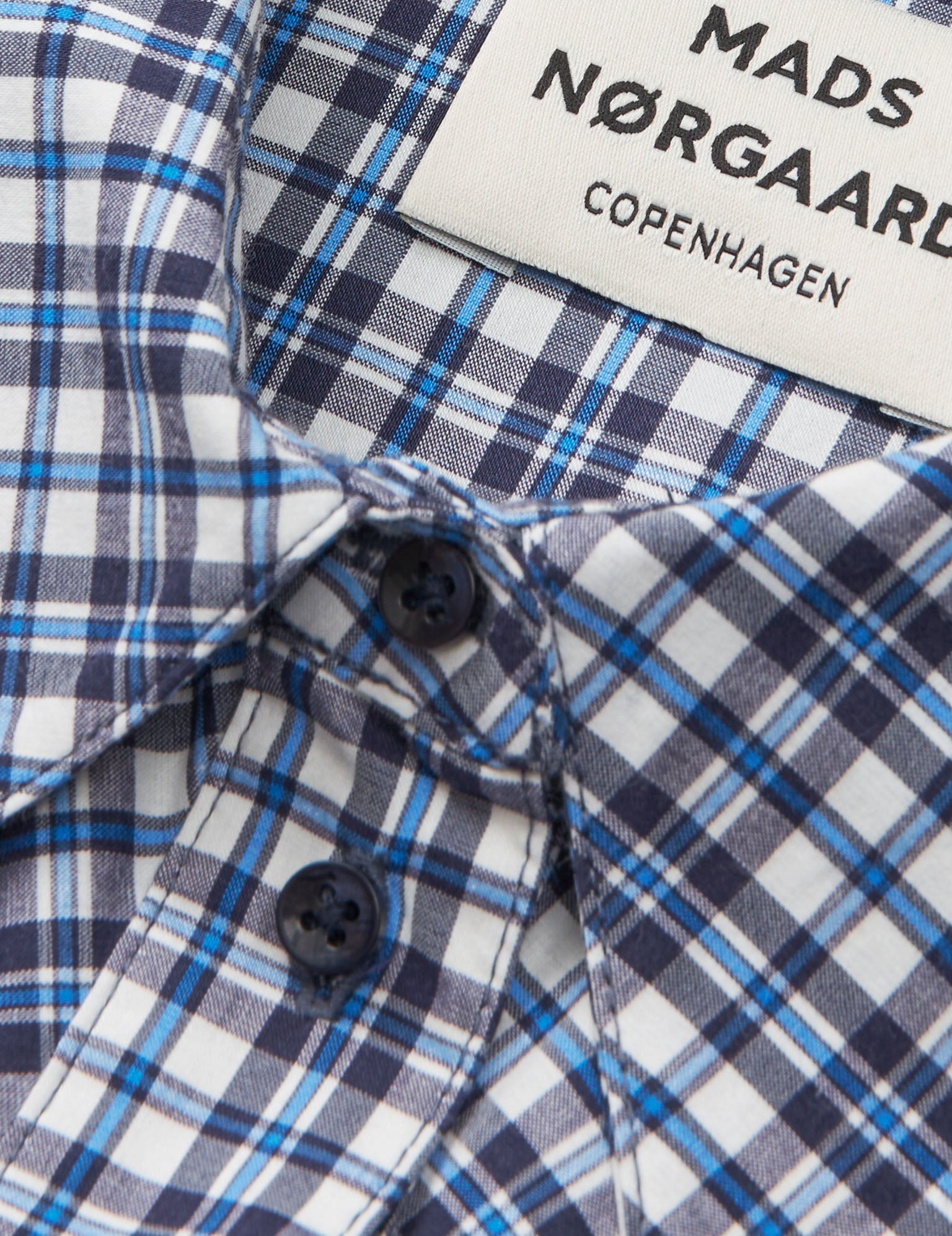 Shirt dress with ruched front, wide skirt, small buttons and rounded turn-down collar.