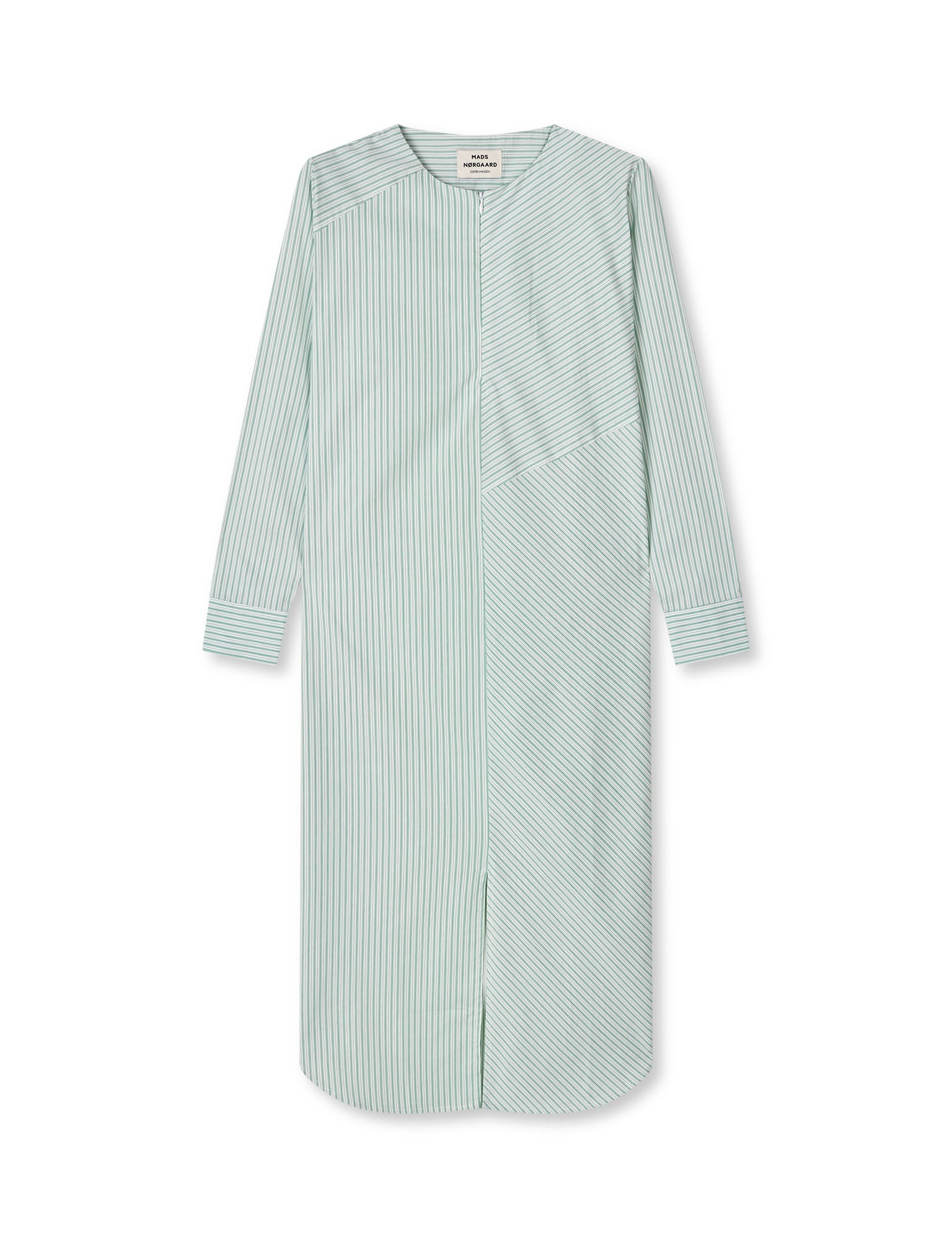 The Poplinda Rosaly dress features a hidden zip in the neck, a calf-length cut, and a slightly oversized, straight up and down fit. The sleeves are long and cuffed.
