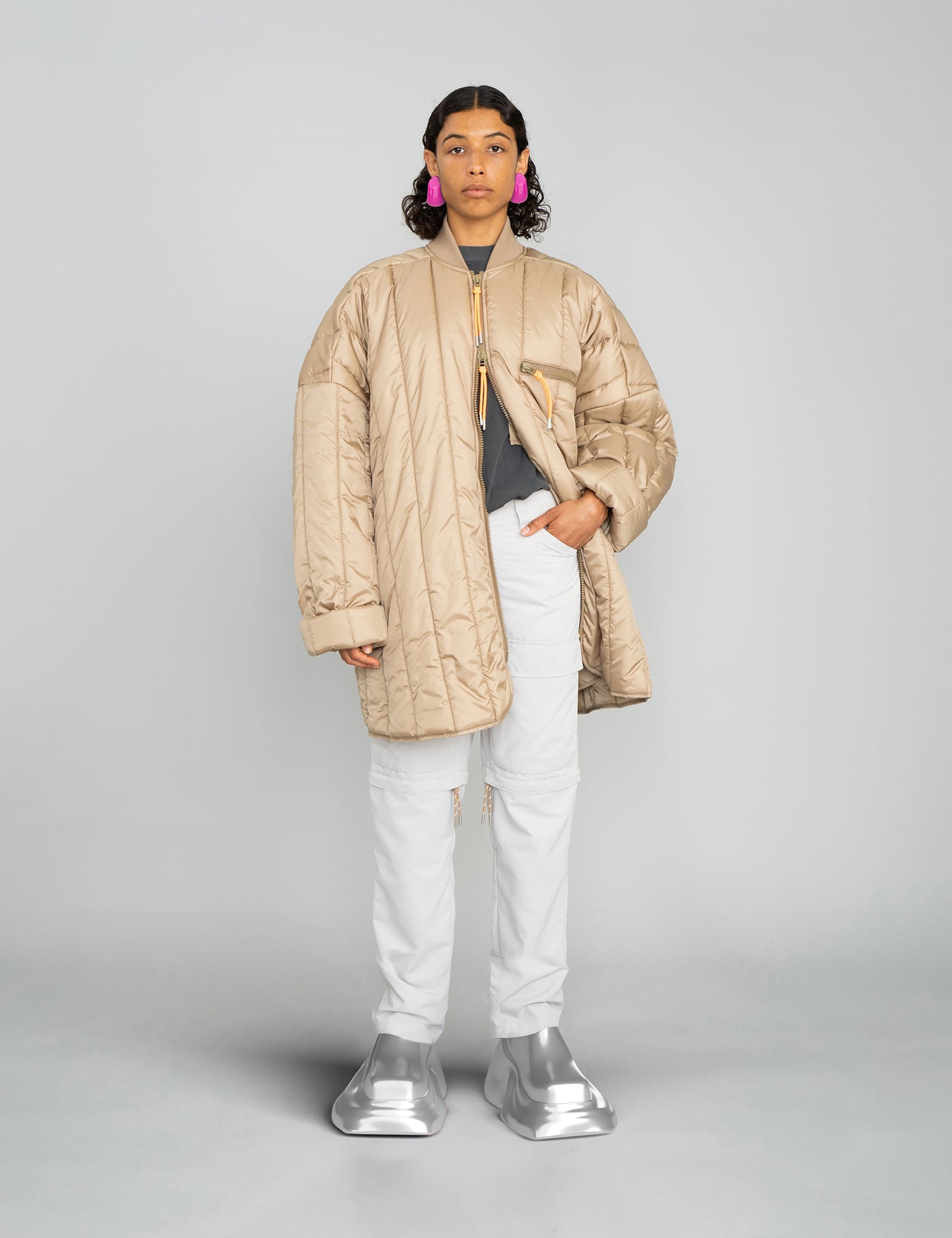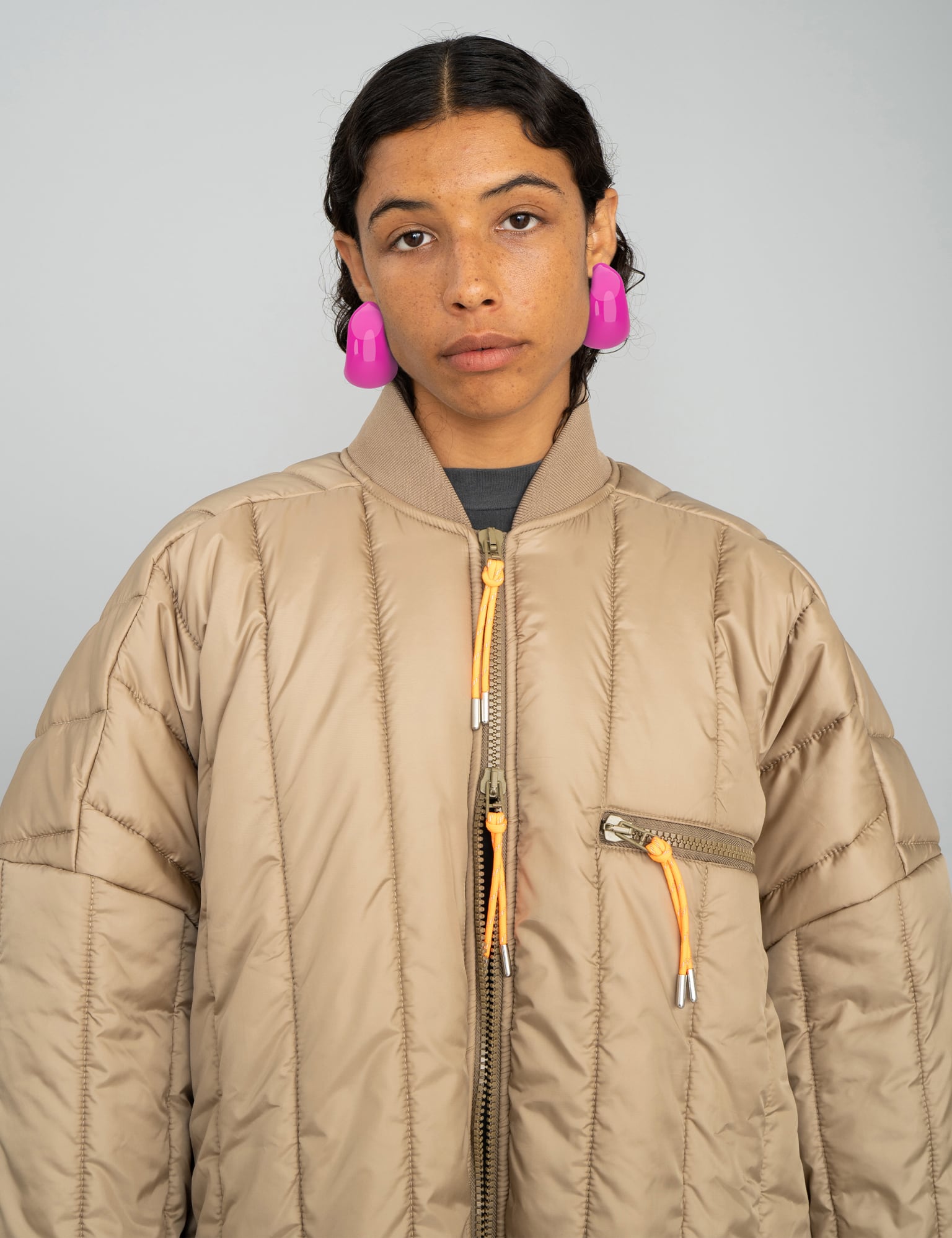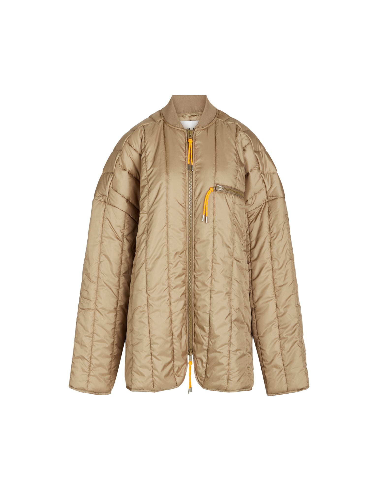 The jacket Recy Poly Rip Cathal Jacket is made of 100 % recycled polyester that is quilted into a both soft and crisp jacket. It is a bit boxy and long, the fit is oversized, the shoulders drop, the neck has rib and both jacket and breast pocket are closed with zipper and orange signal string. Mads Nørgaard and Phanta present “Jumbo Originals”; their first gender-neutral mini collection. Phanta has selected a range of Mads Nørgaard classics such as the sailor knit, quilted jacket and basic t-shirt and played around with oversized, skewed proportions and new colours.
