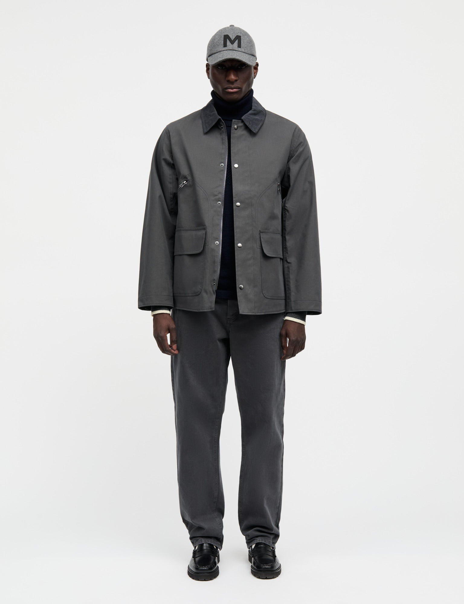 Workwear jacket in heavy cotton canvas. The fit is regular with a contrast corduroy collar, slanted zipped chest pockets, large front flap pockets and snap buttons at the front. Sleeves are plain without cuffs.