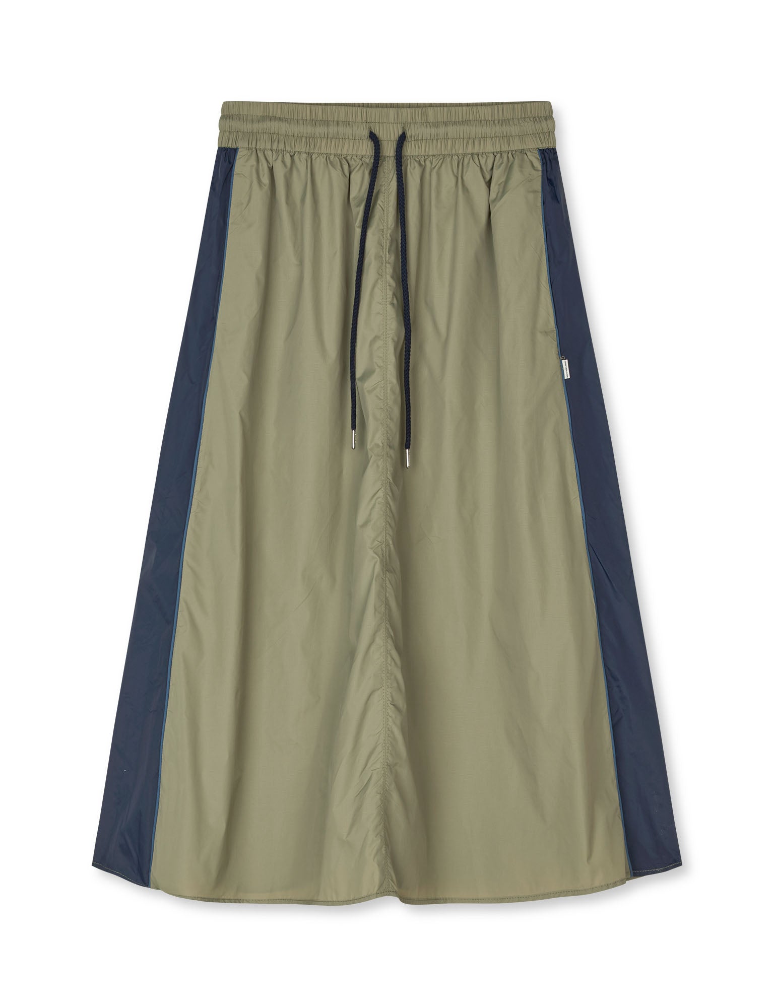 Sporty midi skirt in a medium length with an elastic waistband and adjustable drawstring. Designed with side pockets and contrast piping along the edges.