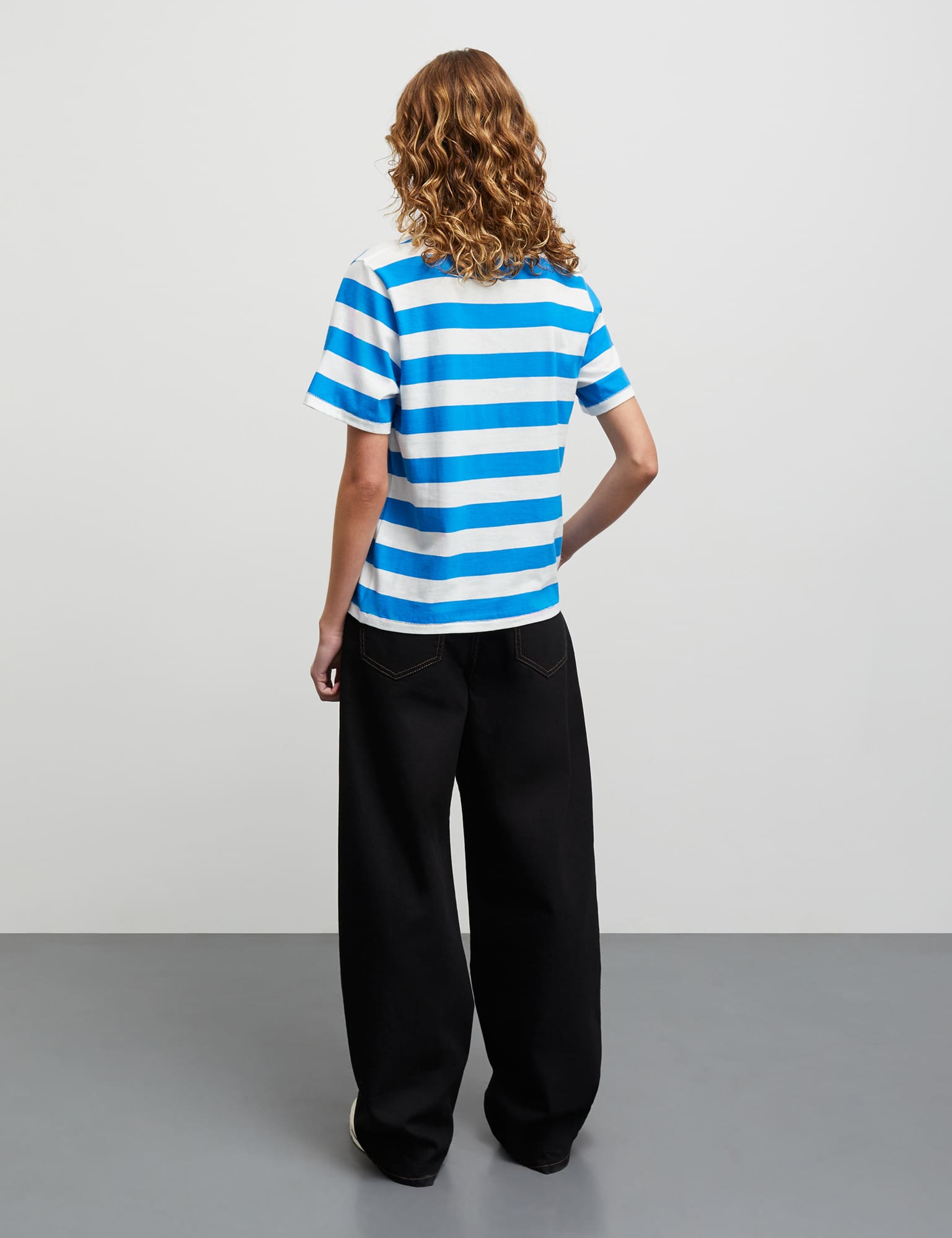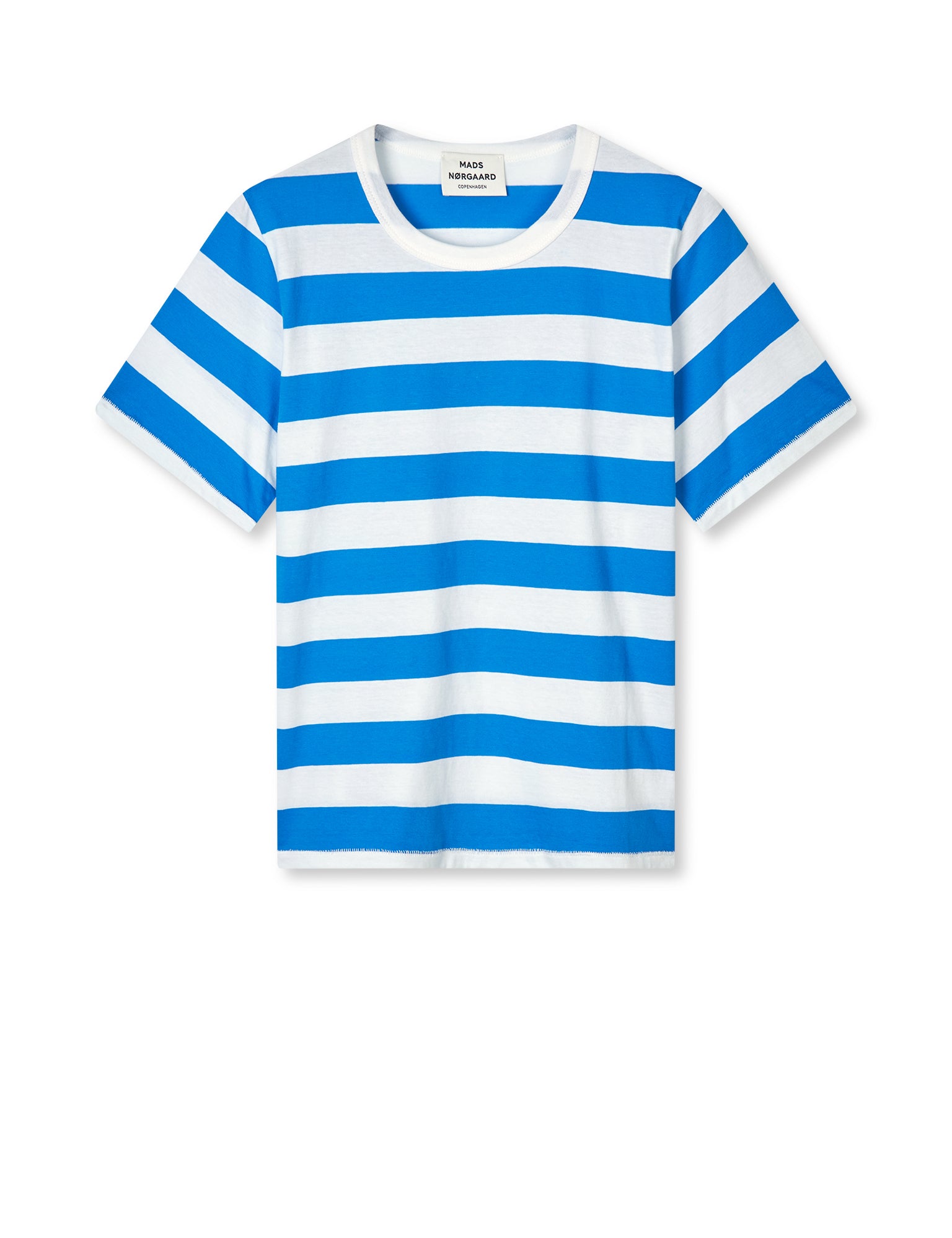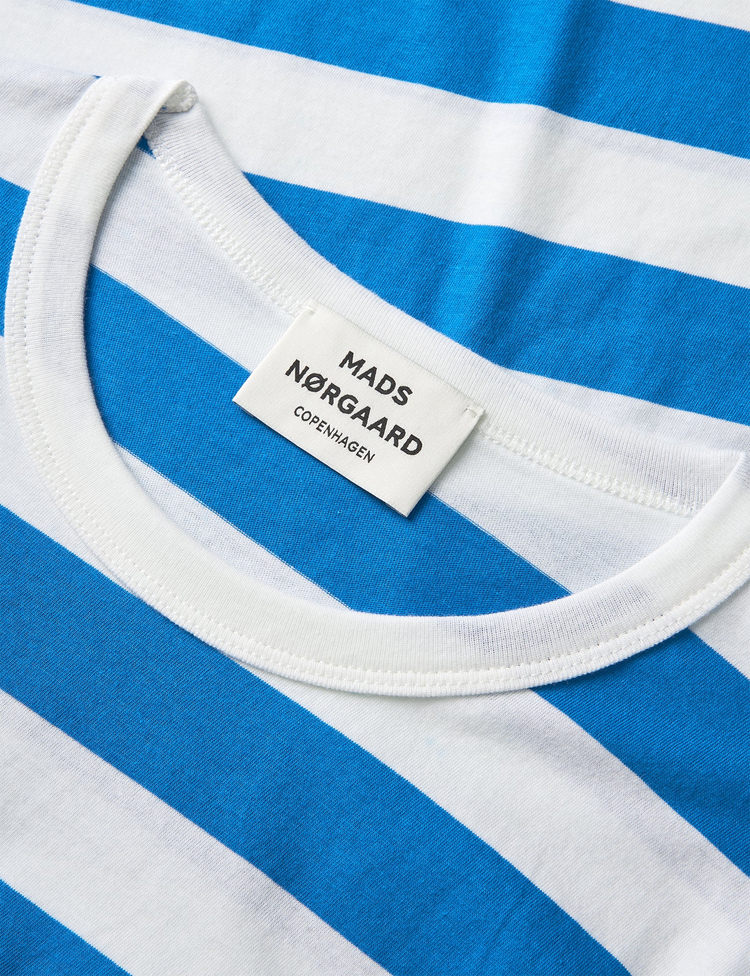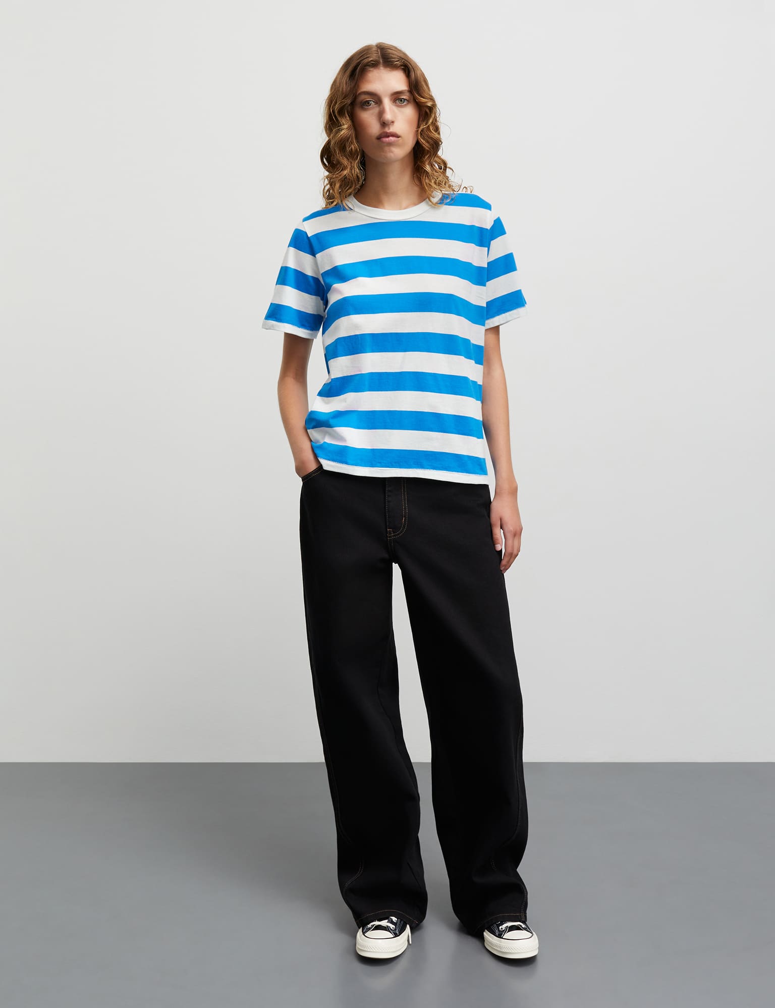 The Single Cotton Grace T-shirt is made from soft, lightweight organic cotton, has a straight up and down fit, and features wide stripes, standard short sleeves and a round neck.